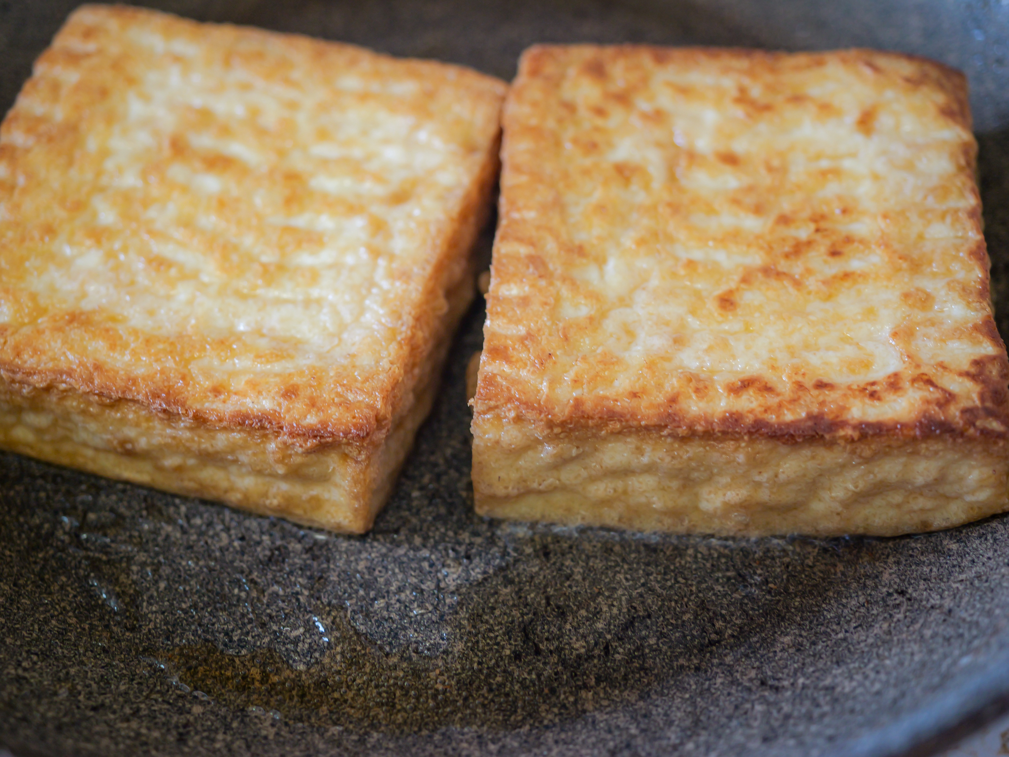 フライパンで適量のごま油を熱し、厚揚げを焼く。焼けたらお皿に移す。