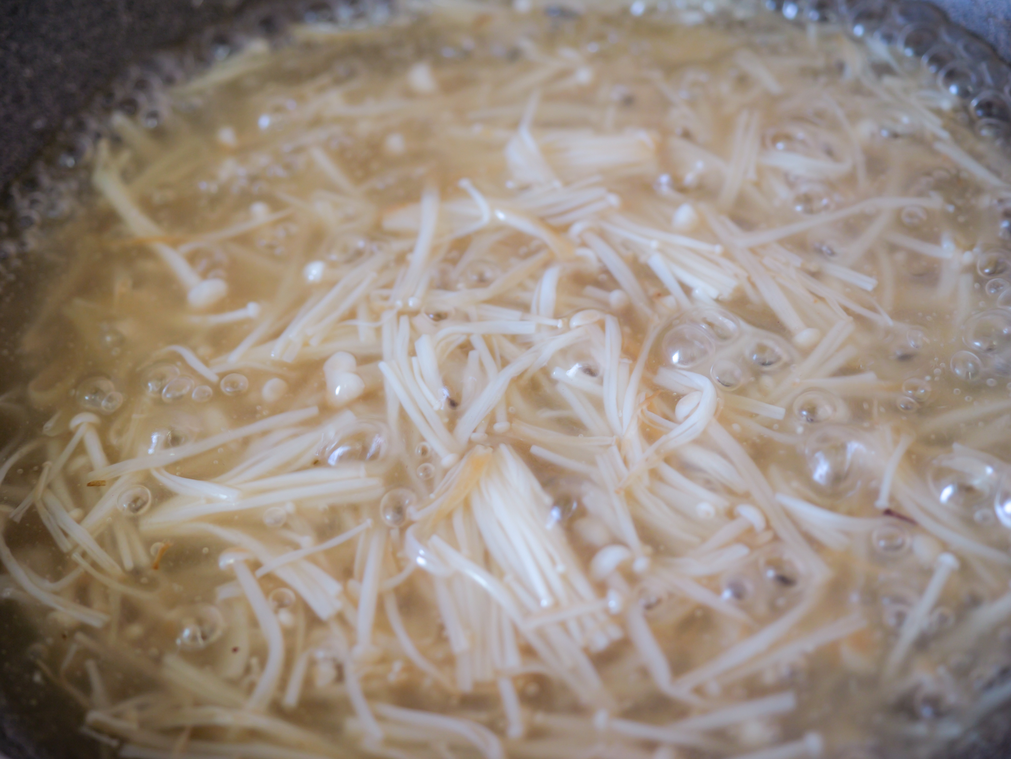 そのままのフライパンでえのきを炒め、しんなりしたらあん掛けの材料(★)を加え、混ぜながらとろみが付くまで加熱する。
