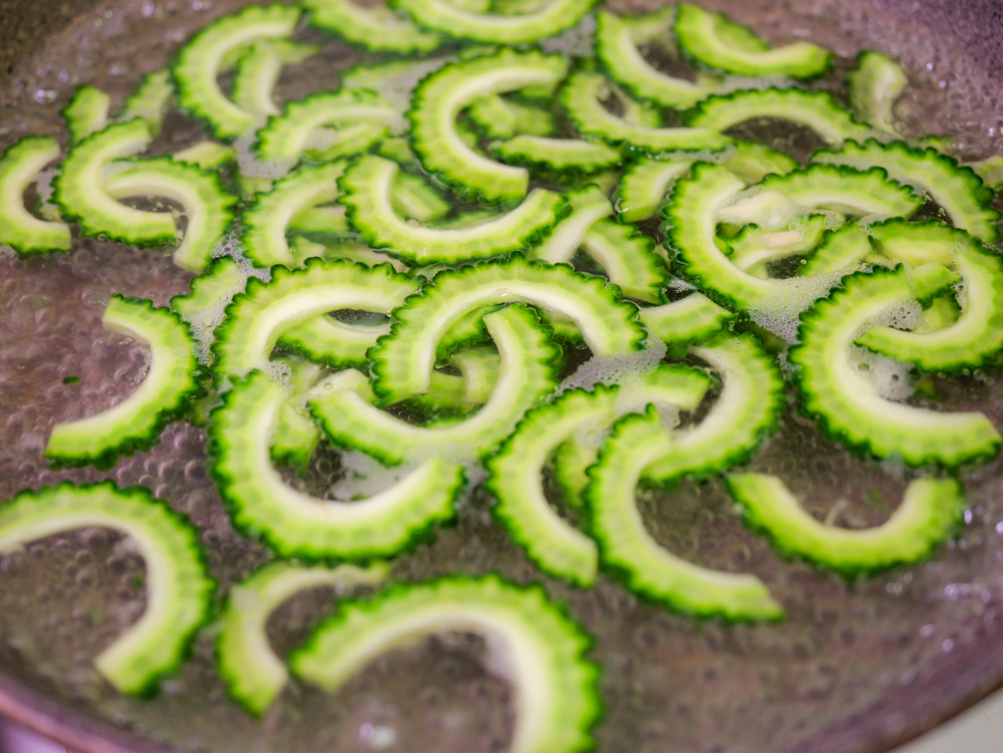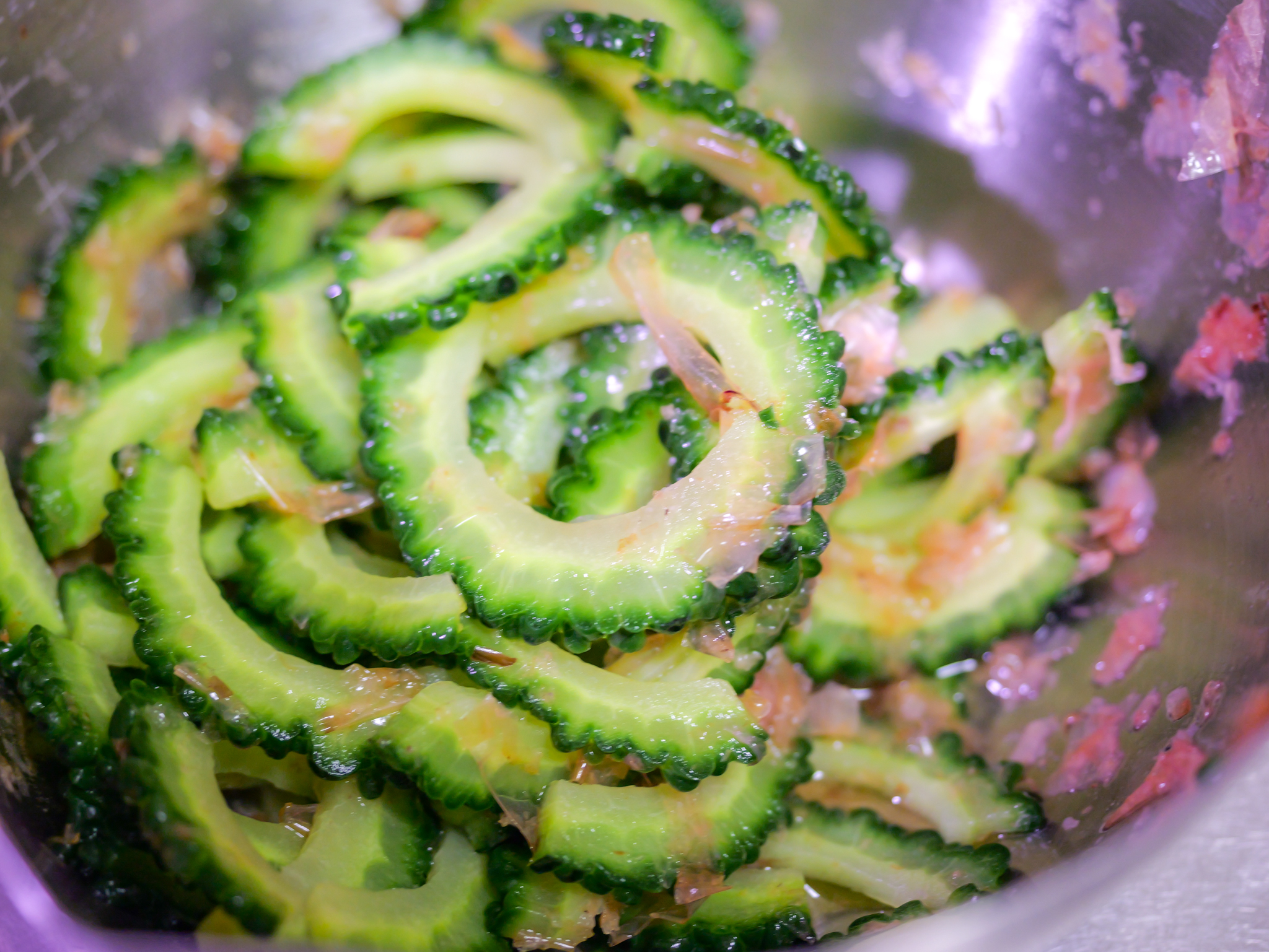 沸騰したお湯に塩を入れ、ゴーヤを1分間茹でる。取り出してたら水に晒し、よく絞っておく。