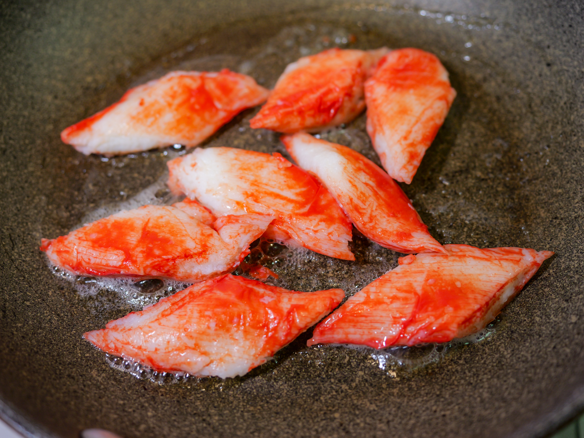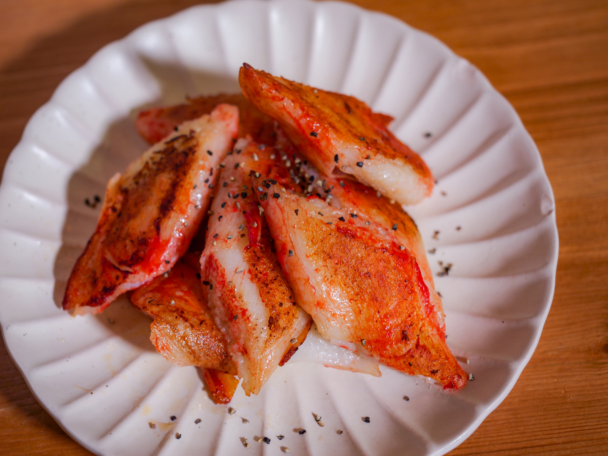 カニカマをバターで炒め、梅酢の酸味でさっぱり仕上げた、簡単おつまみ。