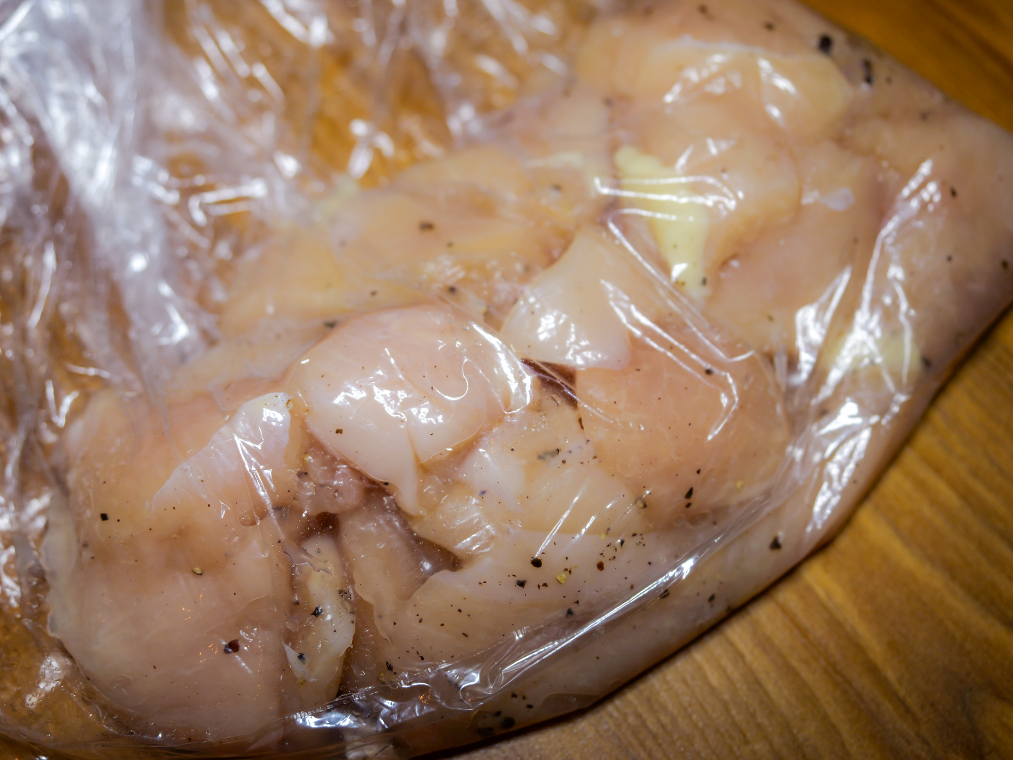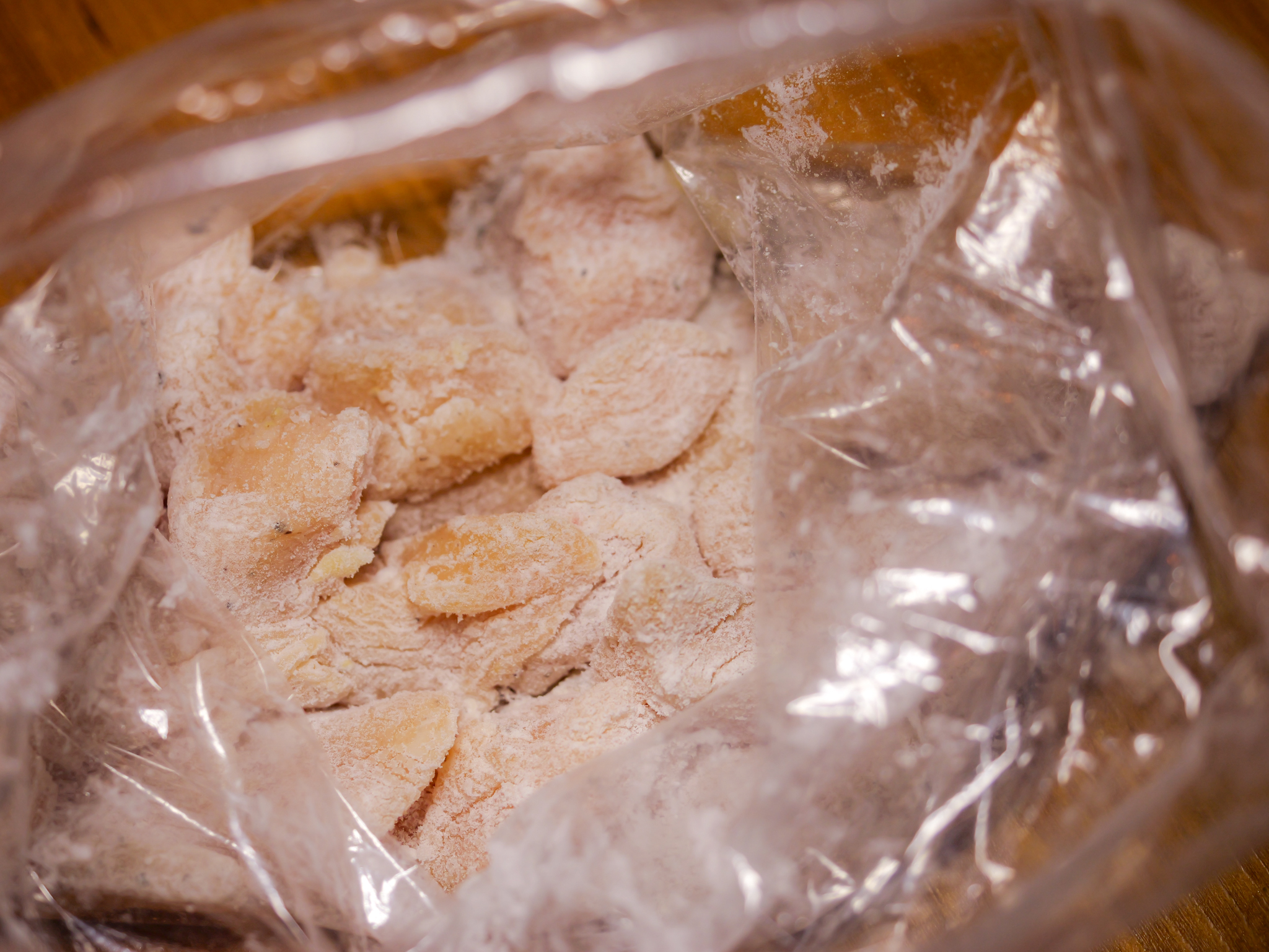 鶏肉を食べやすい大きさに切り、袋に入れ梅酢、料理酒、胡椒を入れ揉みこむ。