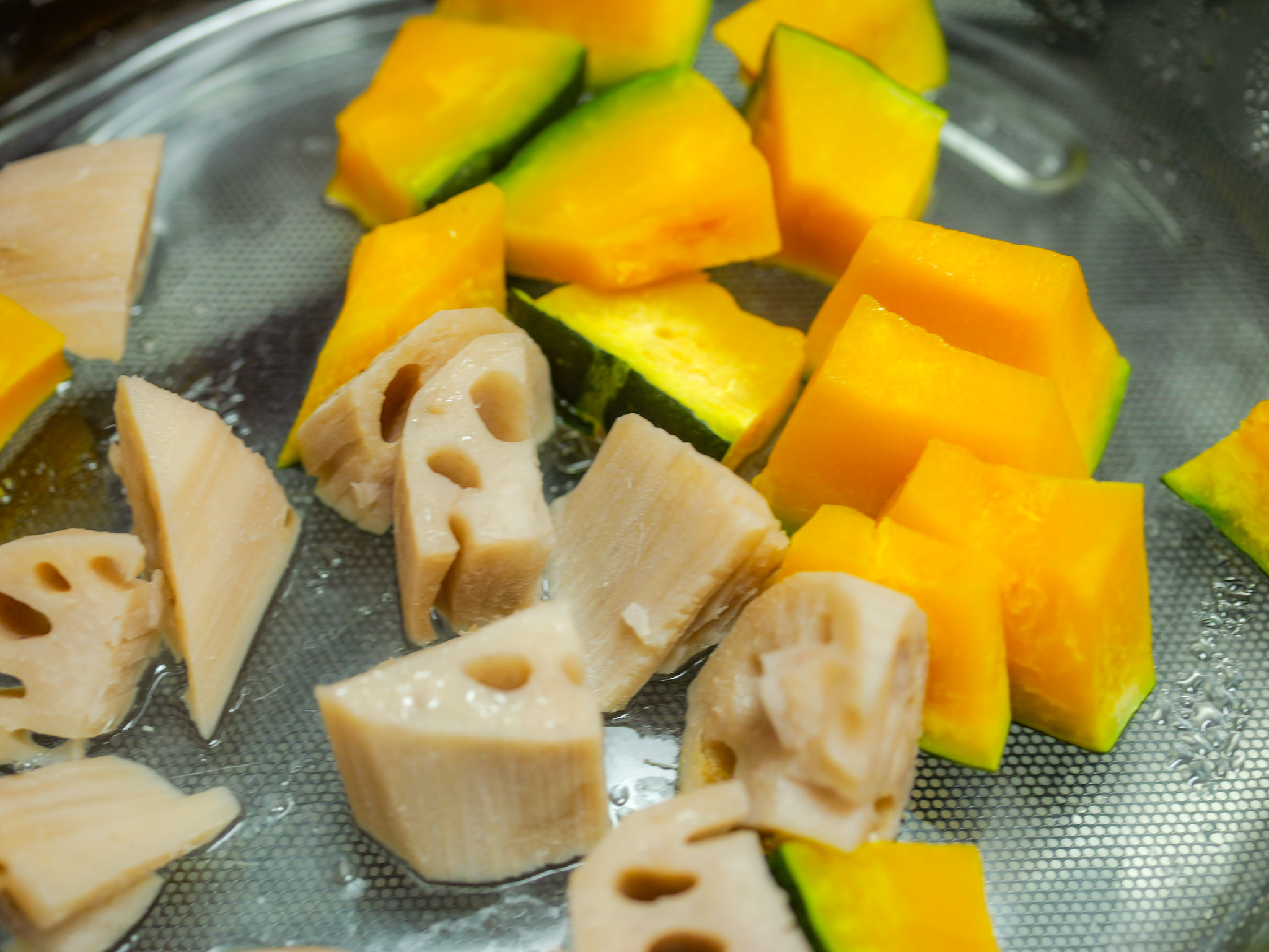 カボチャ、レンコンを食べやすい大きさに切り、耐熱容器に入れレンジ600wで2分加熱。