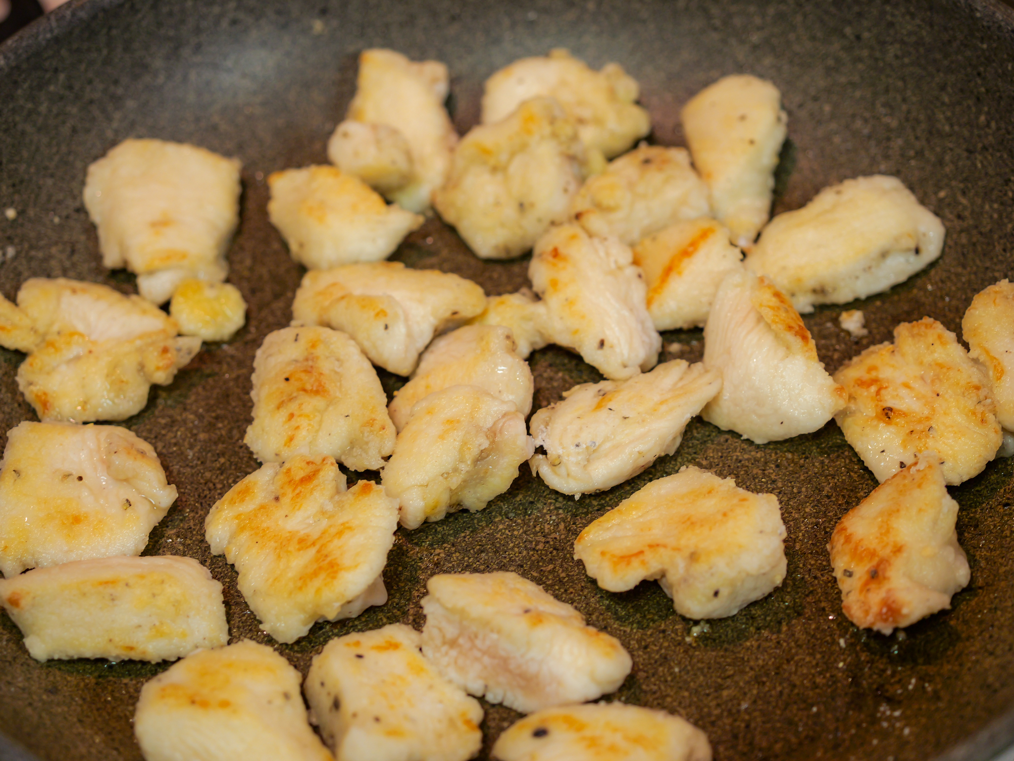 フライパンに油を入れ、片栗粉をまぶした鶏肉を入れ弱火で火が通るまで焼き、取り出しておく。