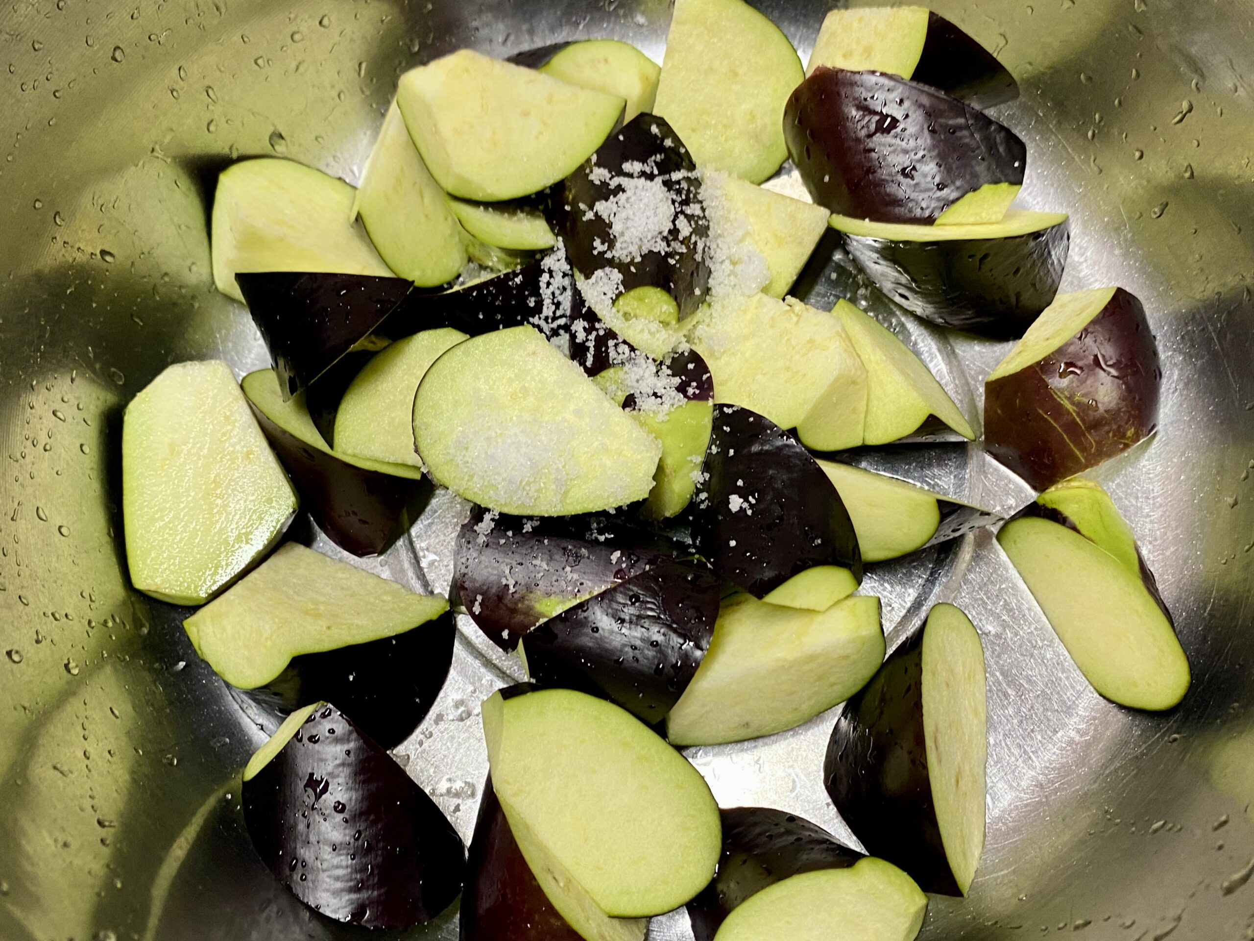 なすは大き目の乱切りにし、塩をまぶして5分置く。