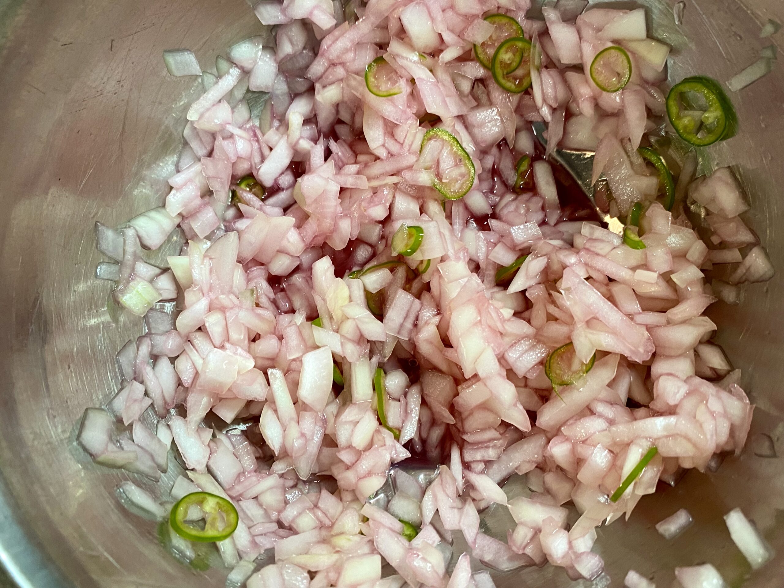 タマネギはみじん切り、唐辛子は輪切りにし、砂糖と紫蘇梅酢と合わせておく。(★)
