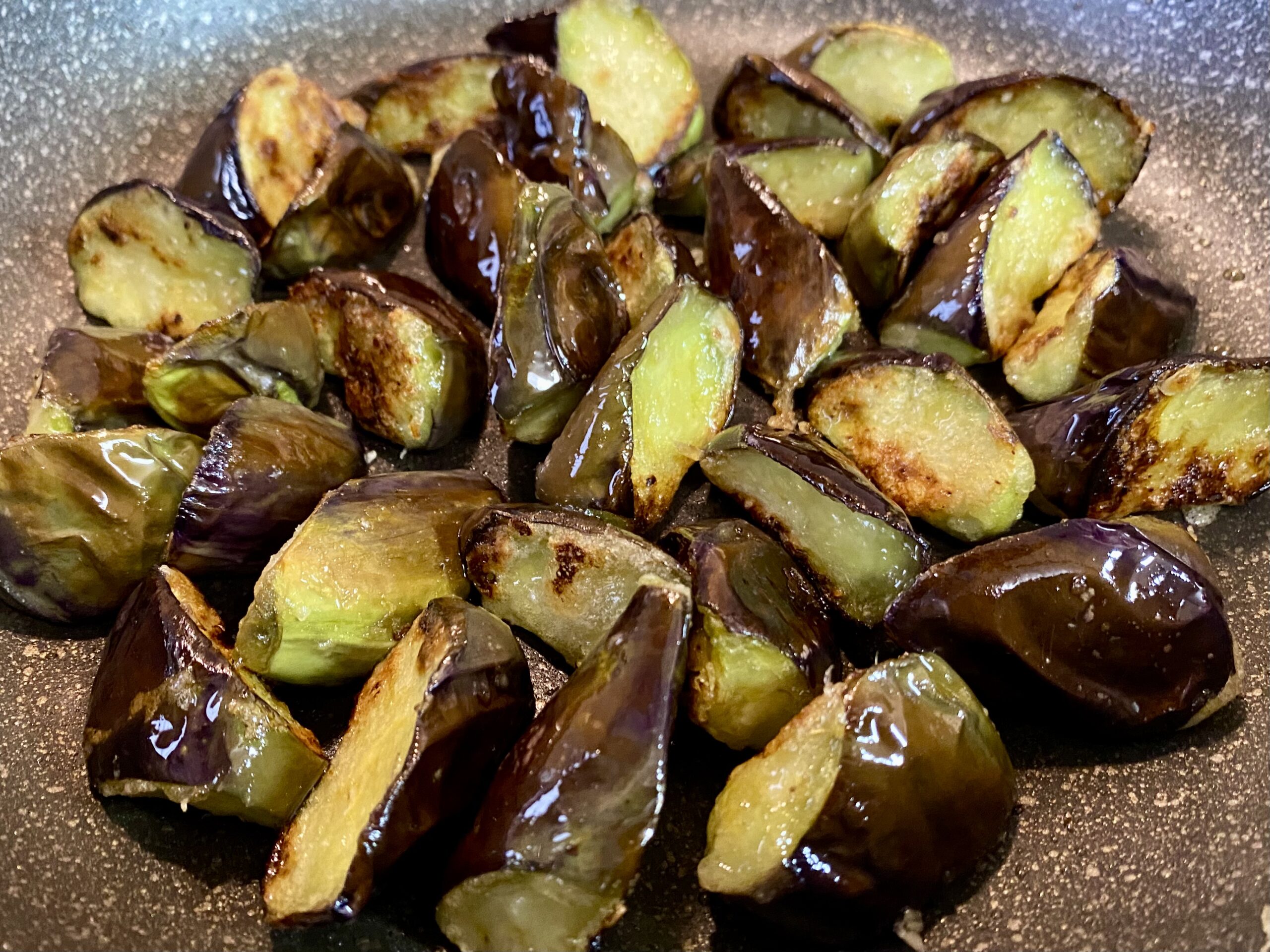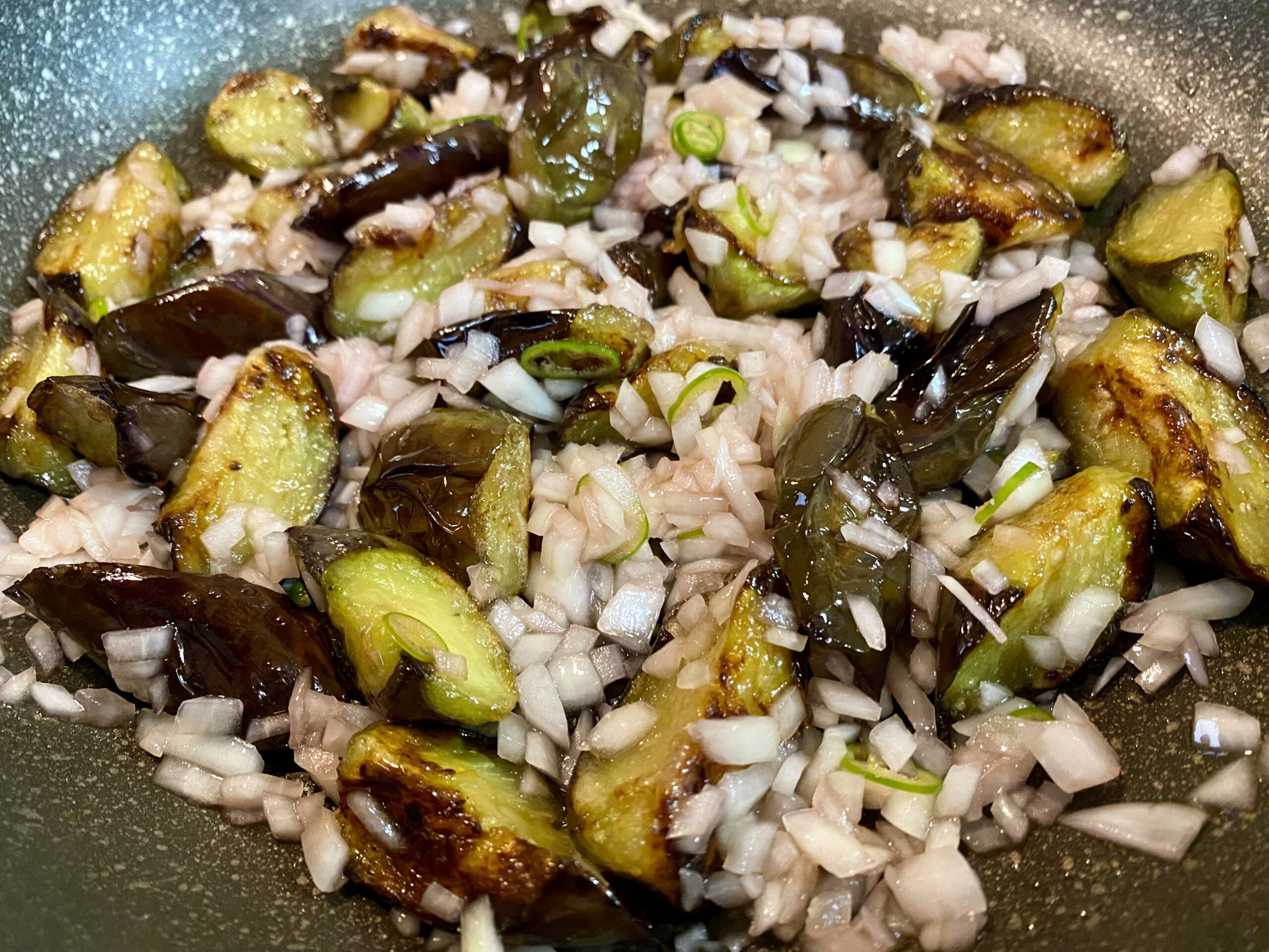 梅酢の酸味と塩味がタマネギの甘み、茄子のコクを引き立てます♪
