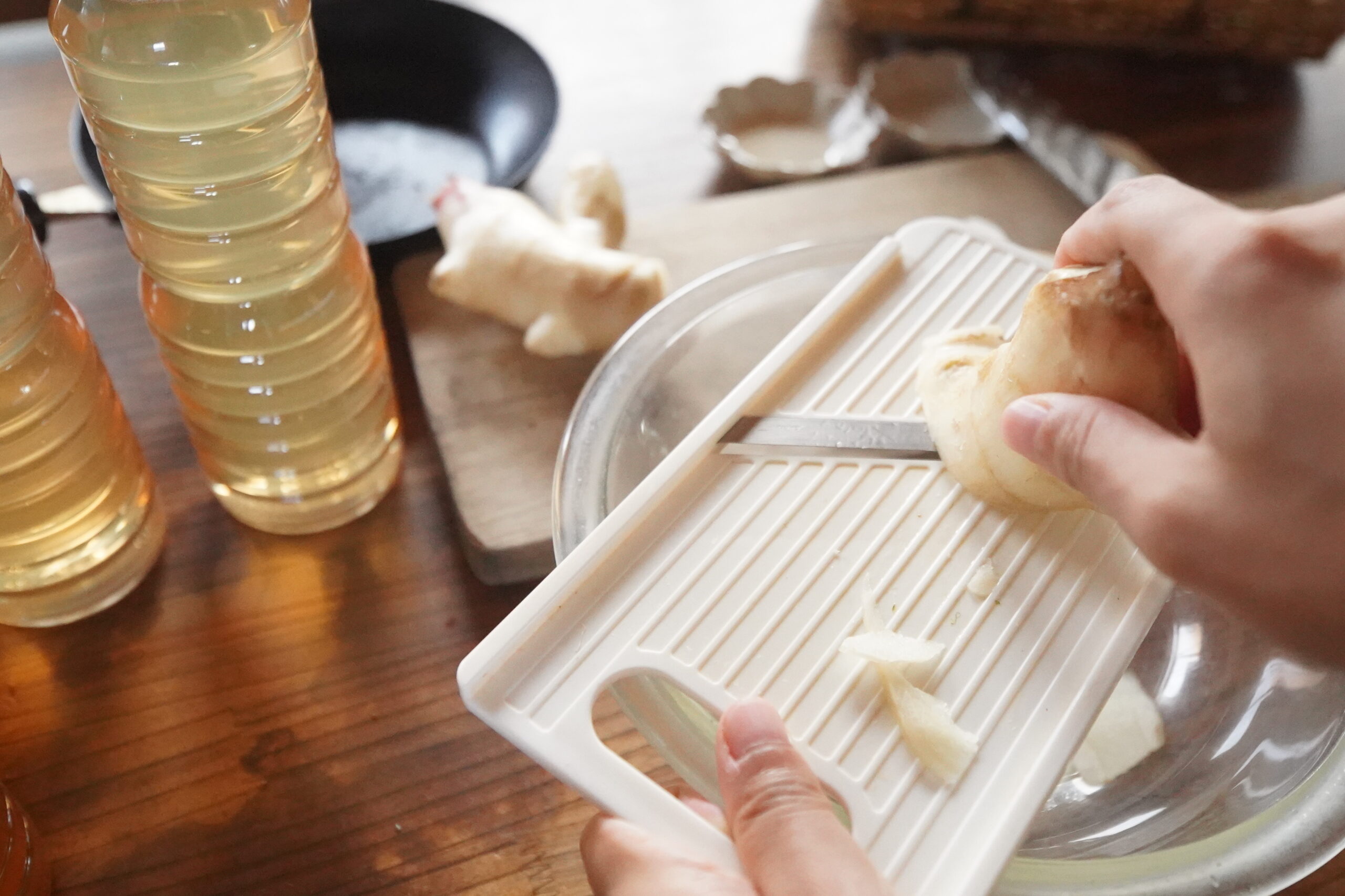 洗った生姜を包丁またはスライサーで食べやすい大きさに切っていく。