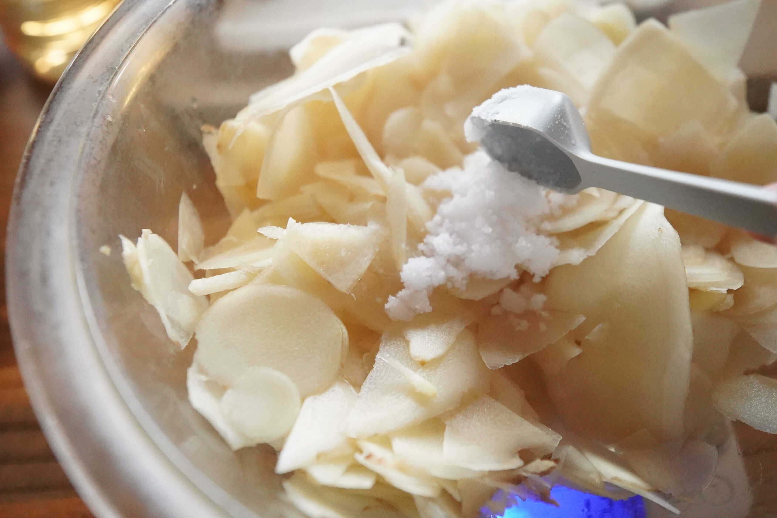 塩をまぶしてよく揉み込み、30分冷蔵庫で寝かせる。