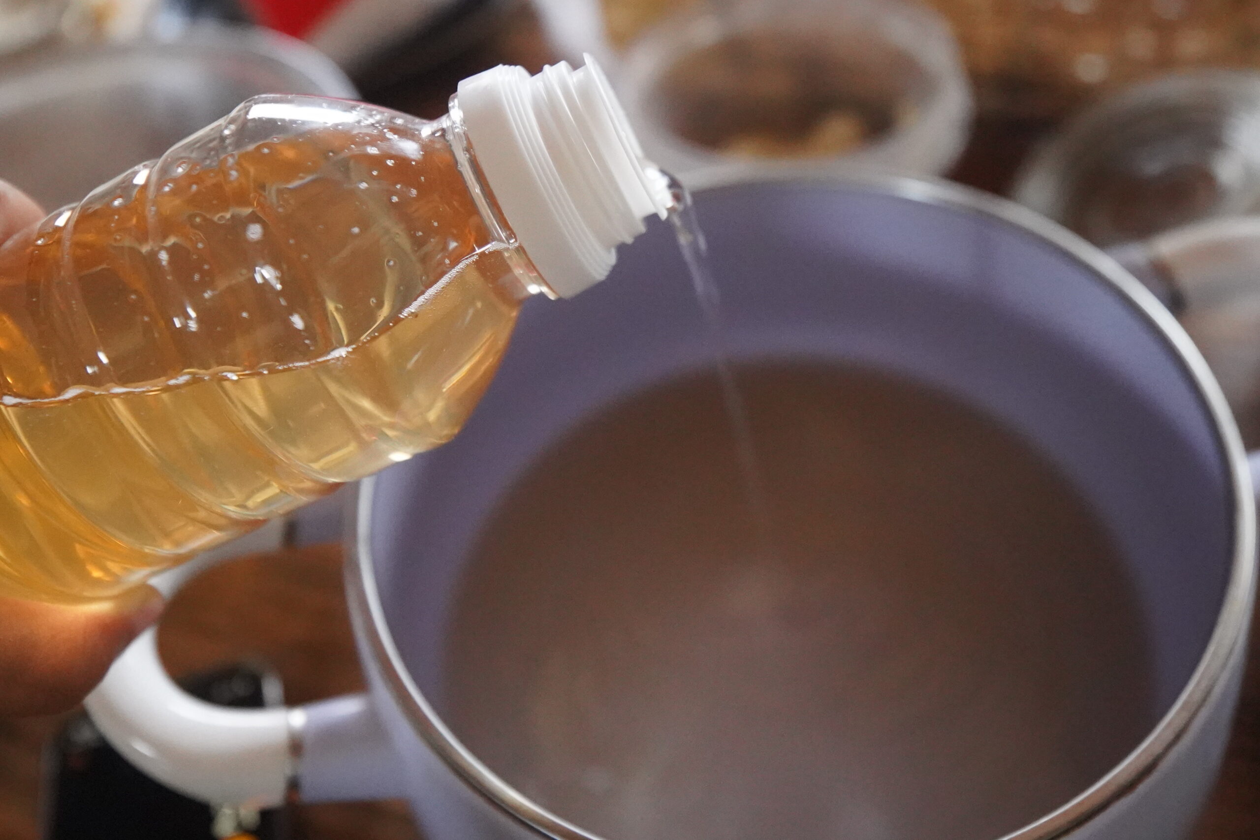 測った生姜に合わせて酢、梅酢、砂糖を計量し鍋に加え、沸騰直前まで火にかける。