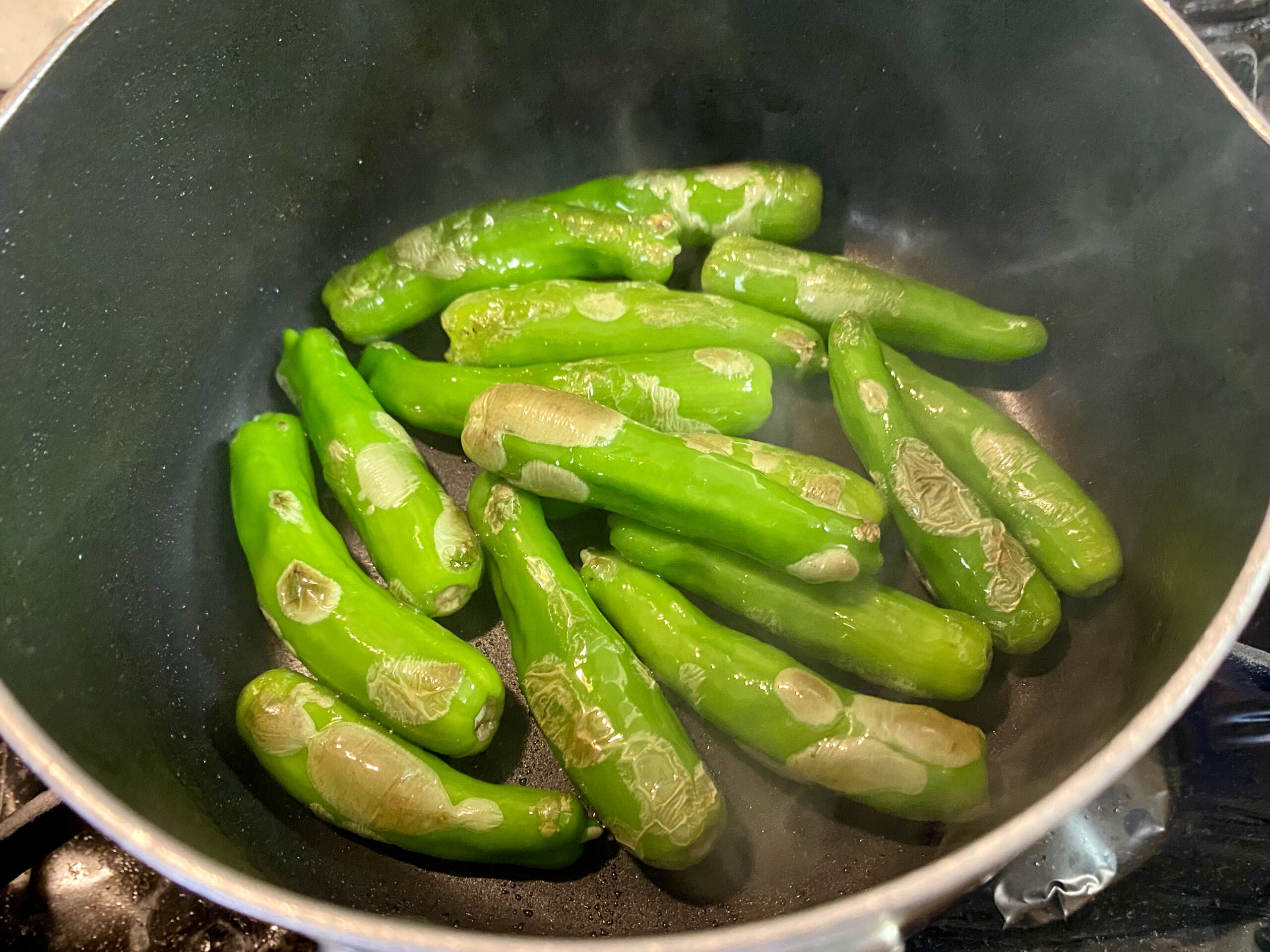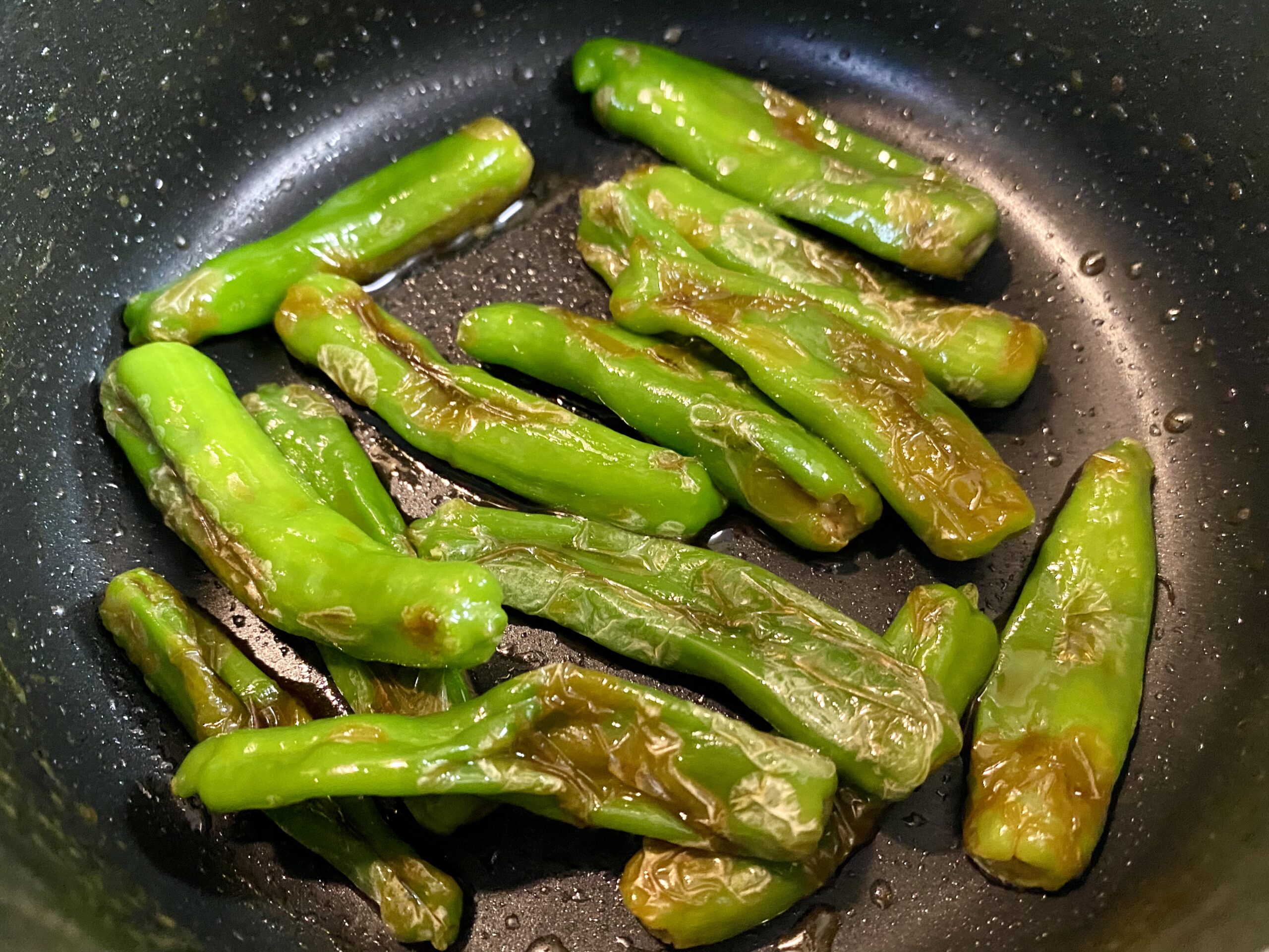 フライパンを熱々に加熱し、ゴマ油でししとうを強火で一気に焼く。