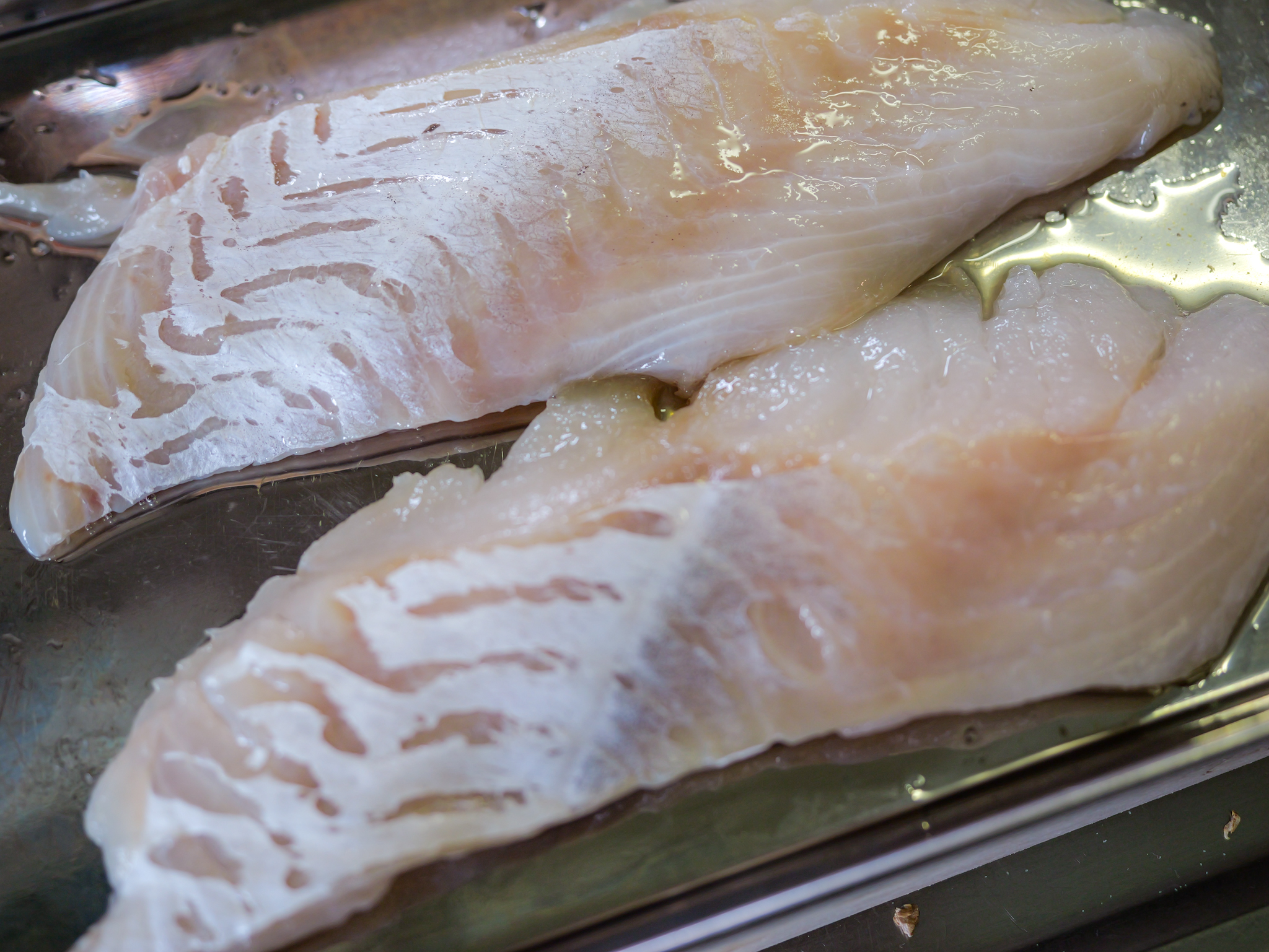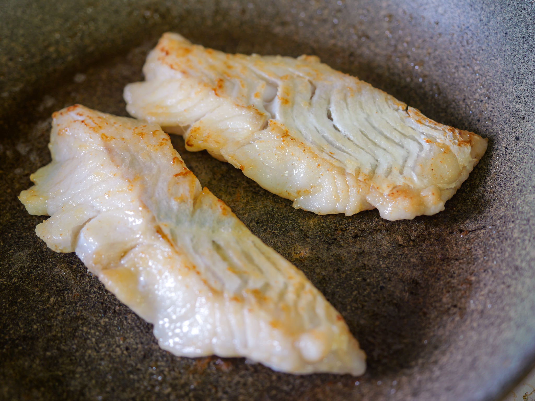 中火でバターを溶かしたフライパンに、タラを皮目から入れ、両面に焼き目がつくまで2~3分焼く。