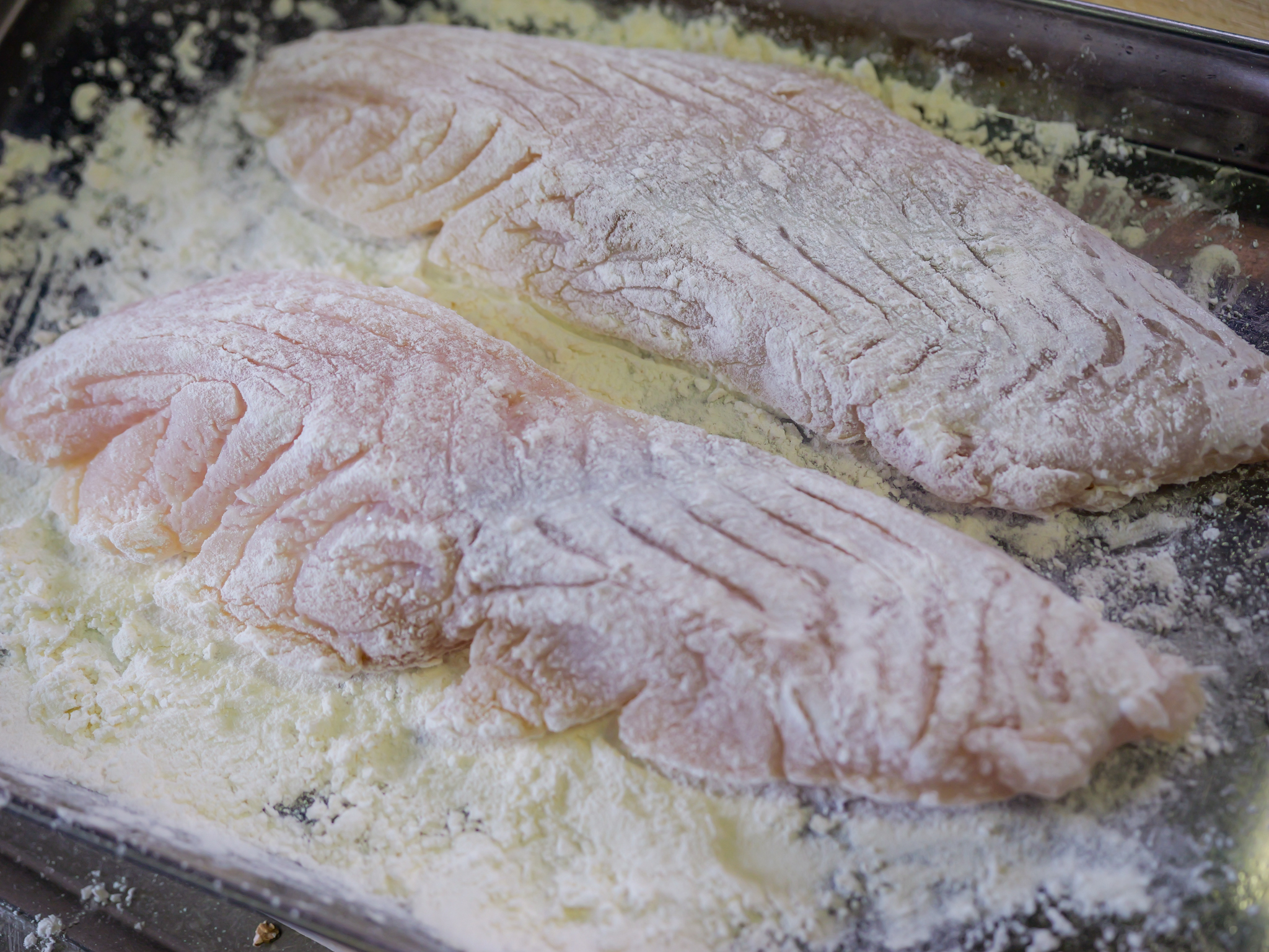 キッチンペーパーで水気を拭き取り、小麦粉をまぶす。