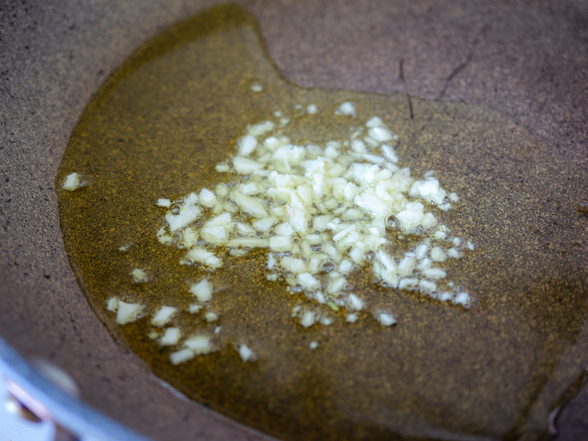 冷たいフライパンにオリーブオイルとみじん切りにしたにんにくを入れ、弱火にかける。
