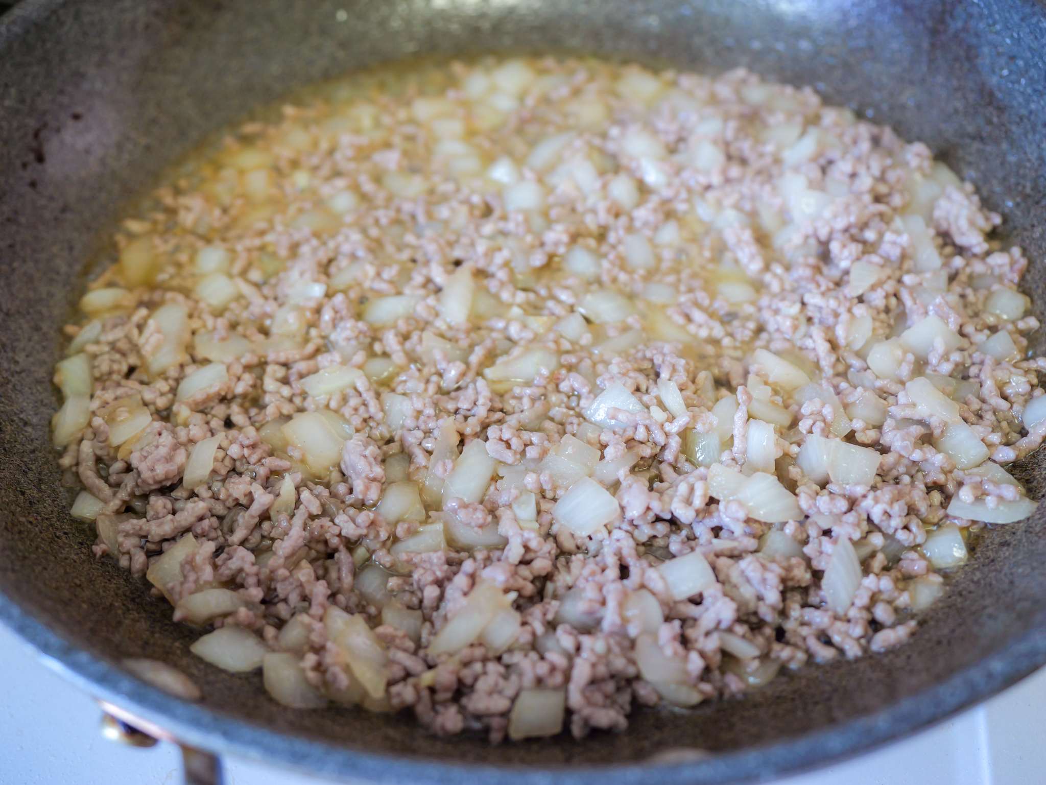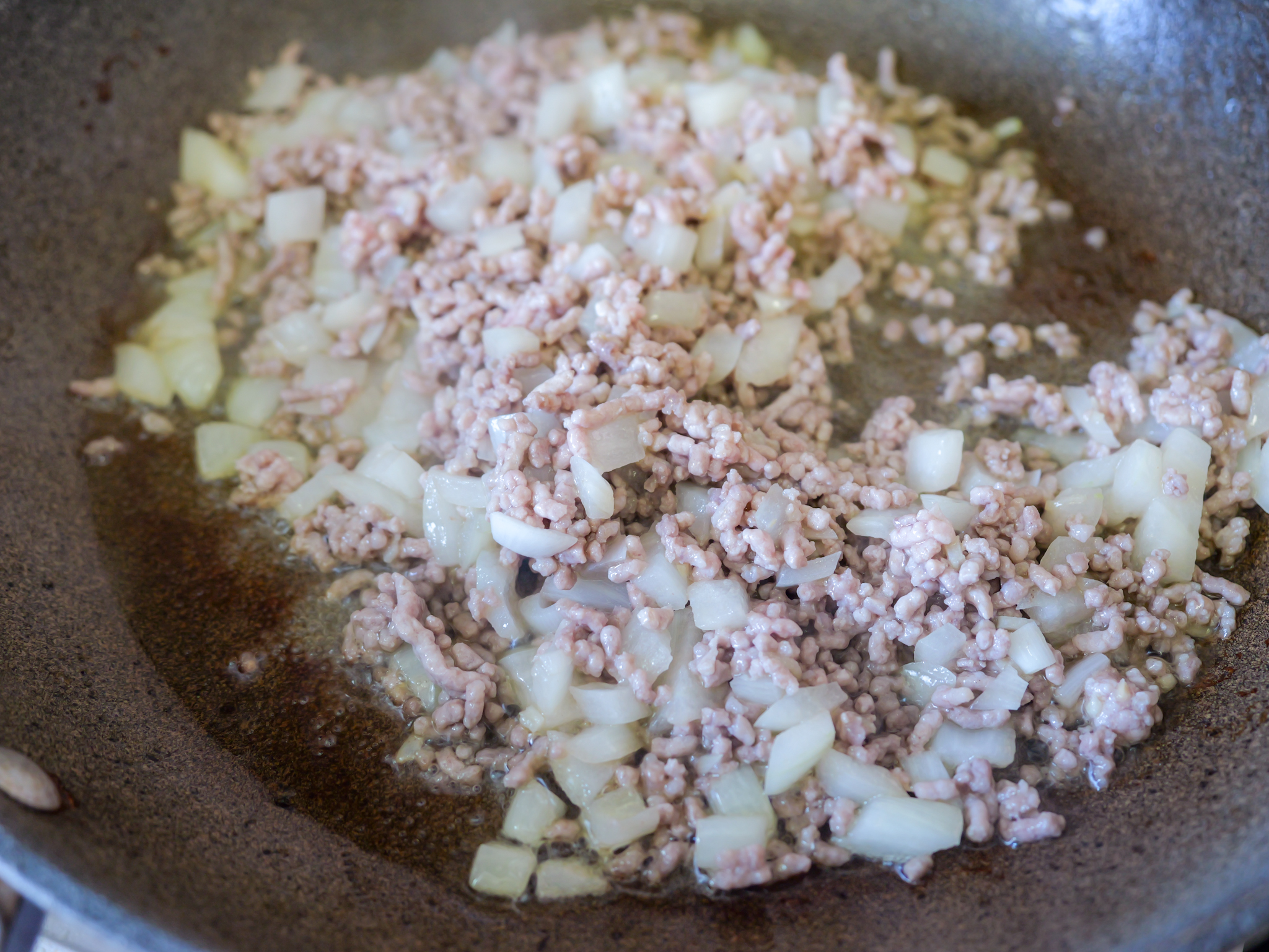 ニンニクの香りが立ってきたら、粗いみじん切りにした玉ねぎと合い挽き肉を加え、火を通す。