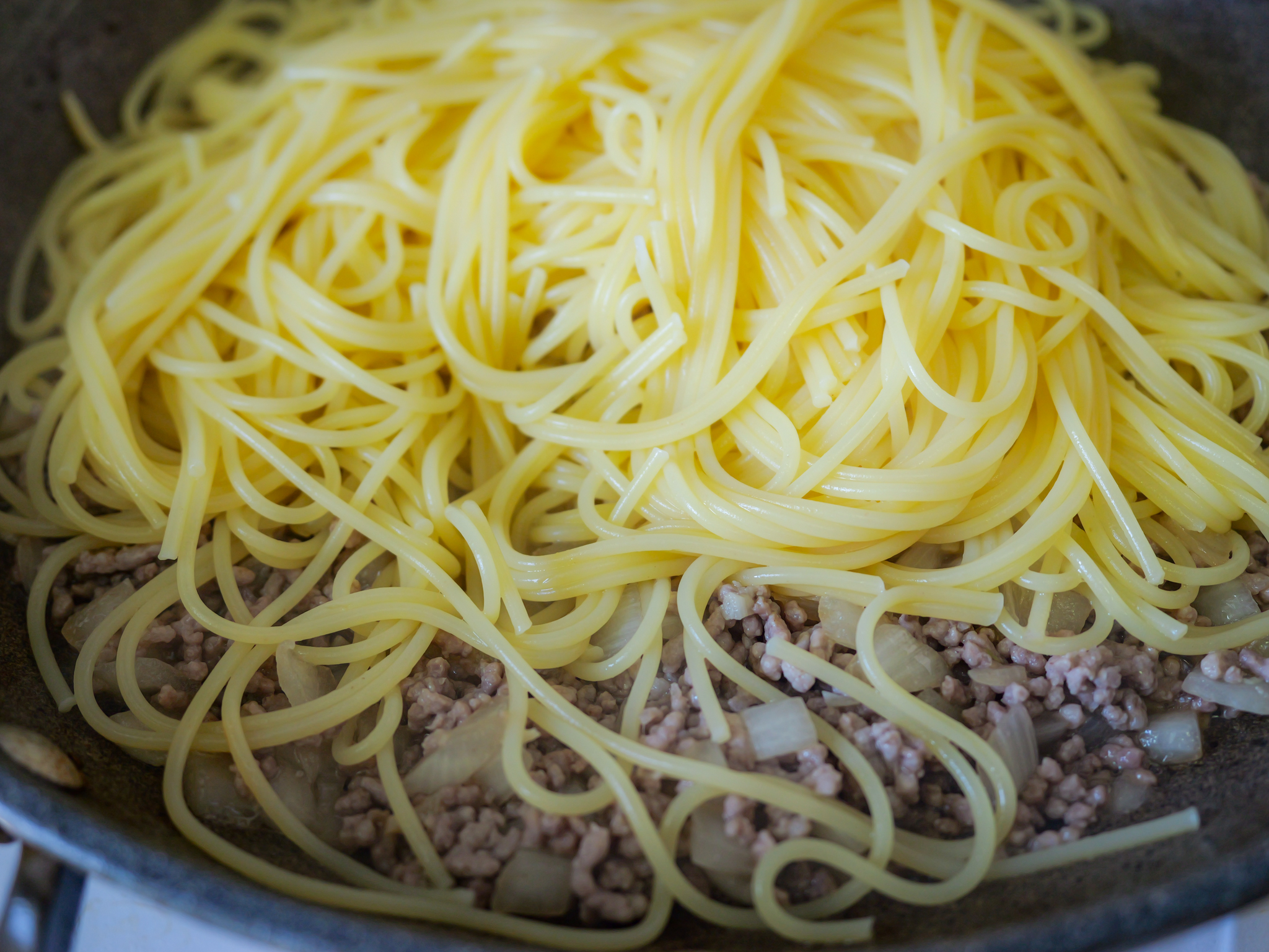 茹で上がったパスタをフライパンに加え、しっかりと混ぜ合わせてソースを乳化させる。