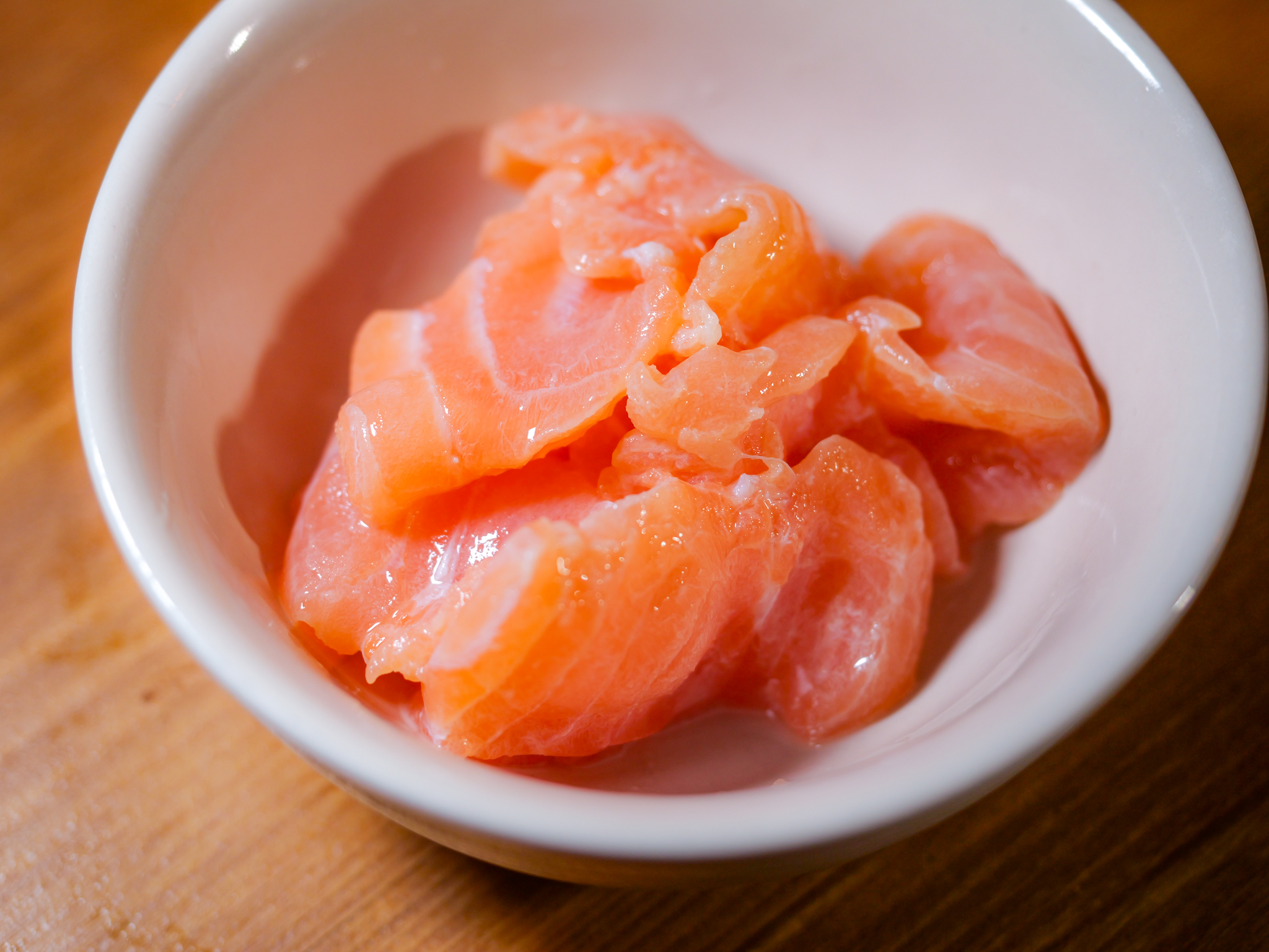 刺身を薄切りにしボウルに入れ、梅酢を馴染ませ15分寝かせる。(50gに対して小さじ1)