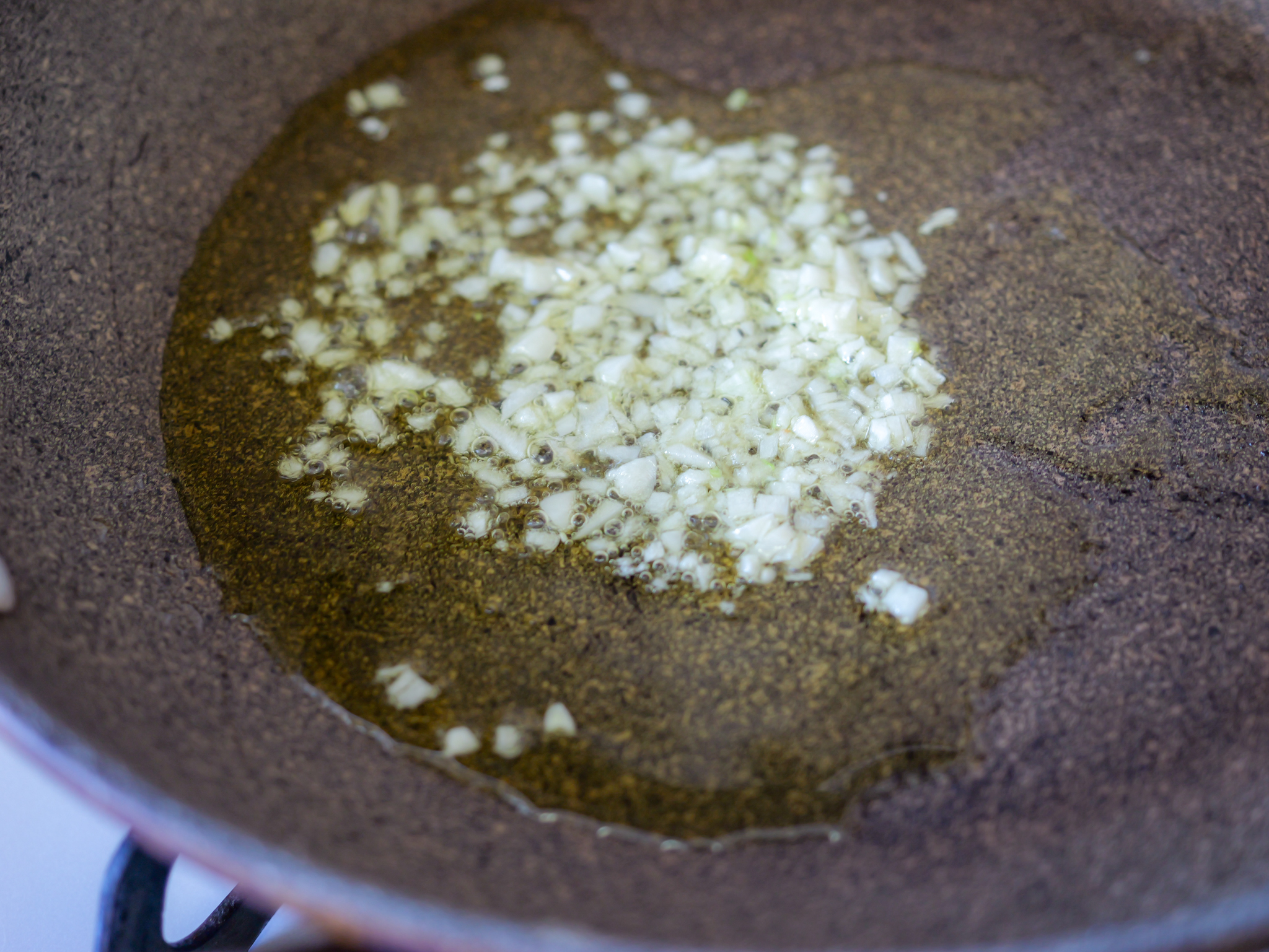 オリーブオイルをフライパンに入れ火にかけ、みじん切りにしたニンニクを弱火で熱する。