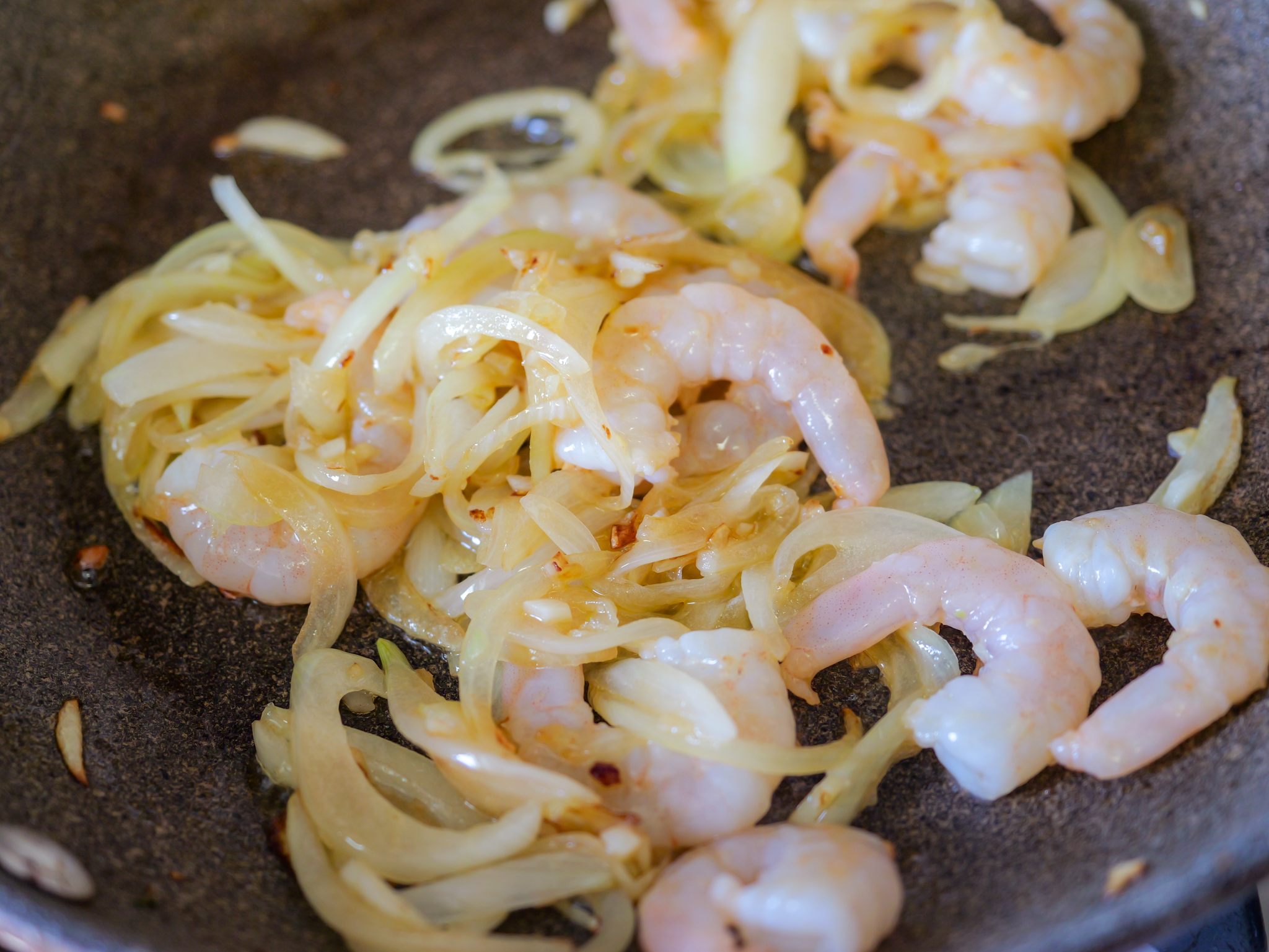 ニンニクの香りが立ったら薄くスライスした玉ねぎを入れ、しんなりするまで炒める。