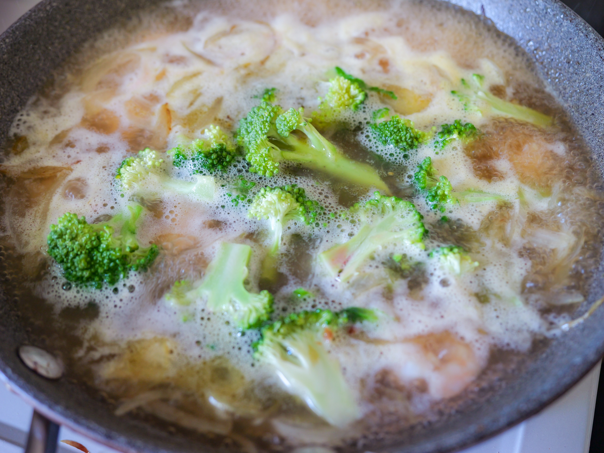 鍋に水を入れて火にかけ、沸騰したら③とブロッコリー、コンソメ、梅酢、砂糖を入れる。