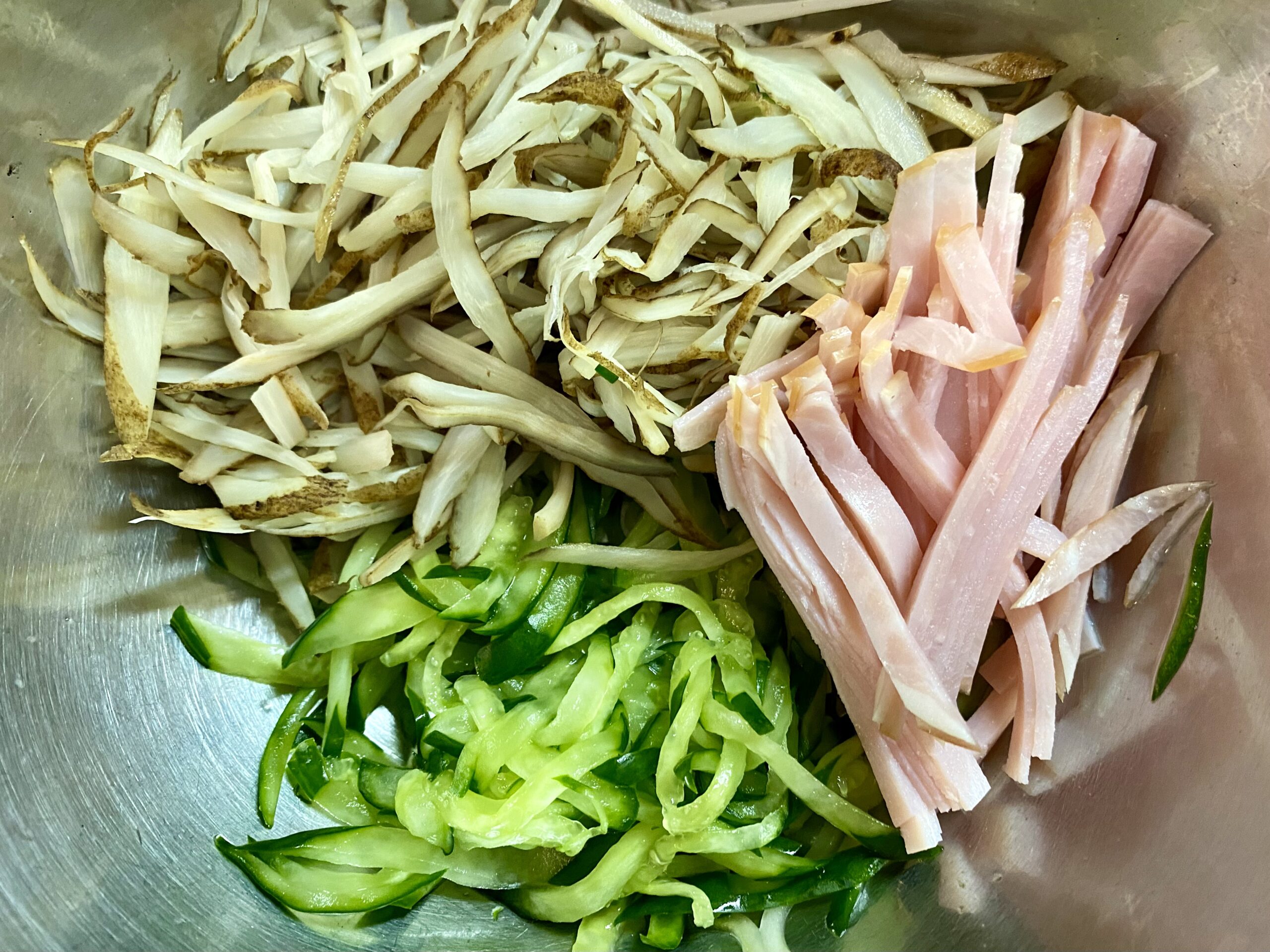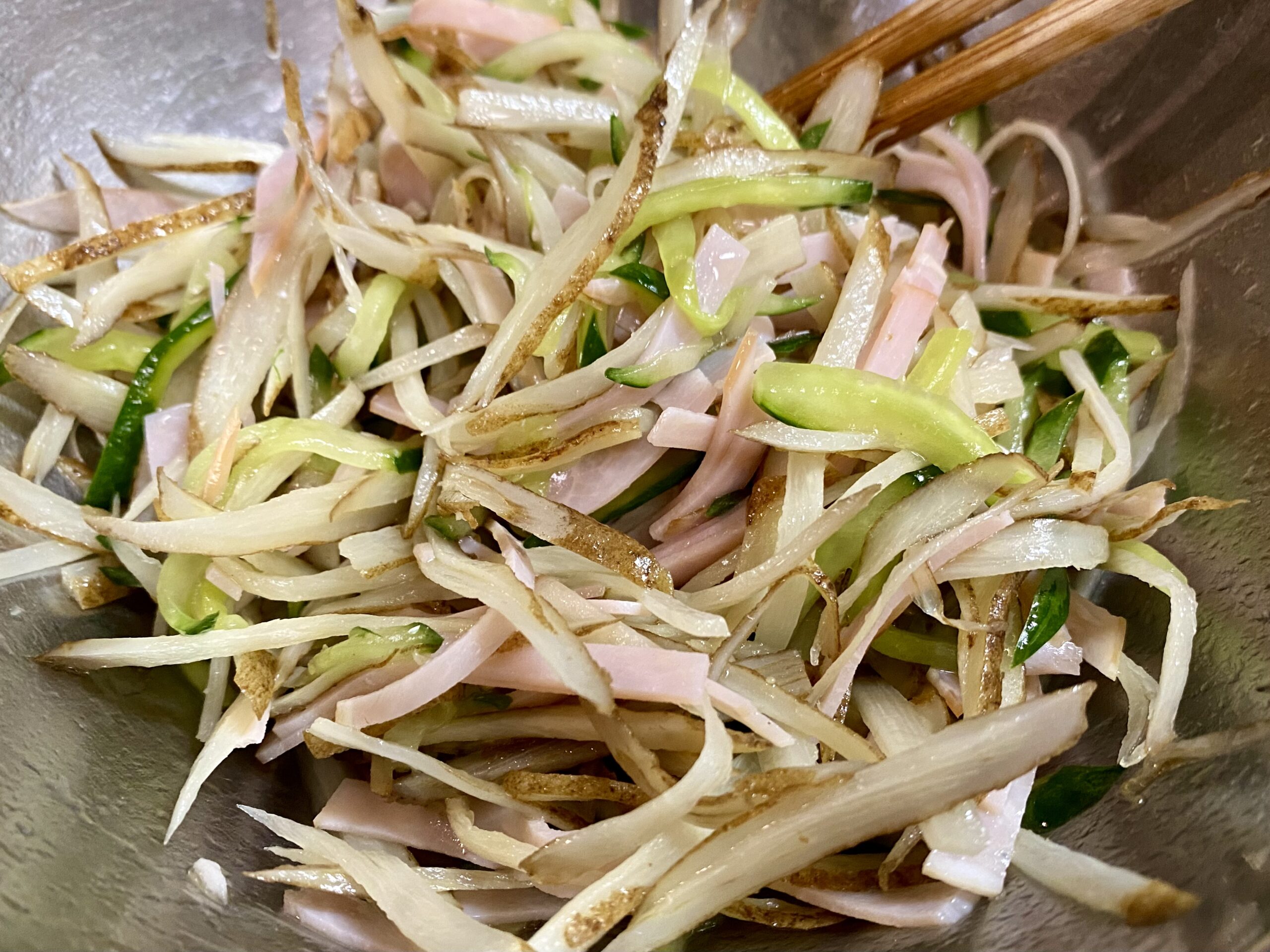 ゴボウはささがき、キュウリは千切り、ハムは細切りする。