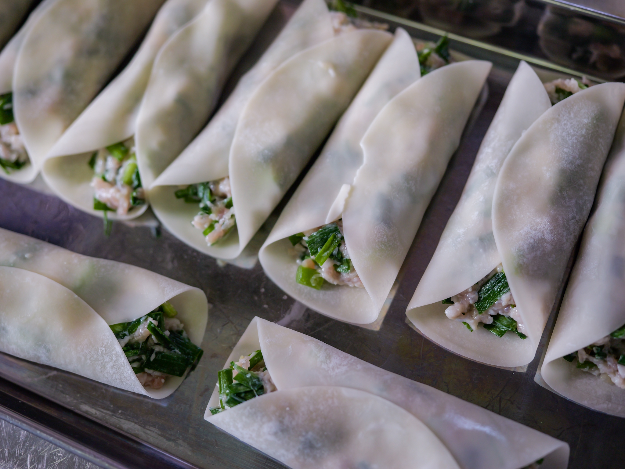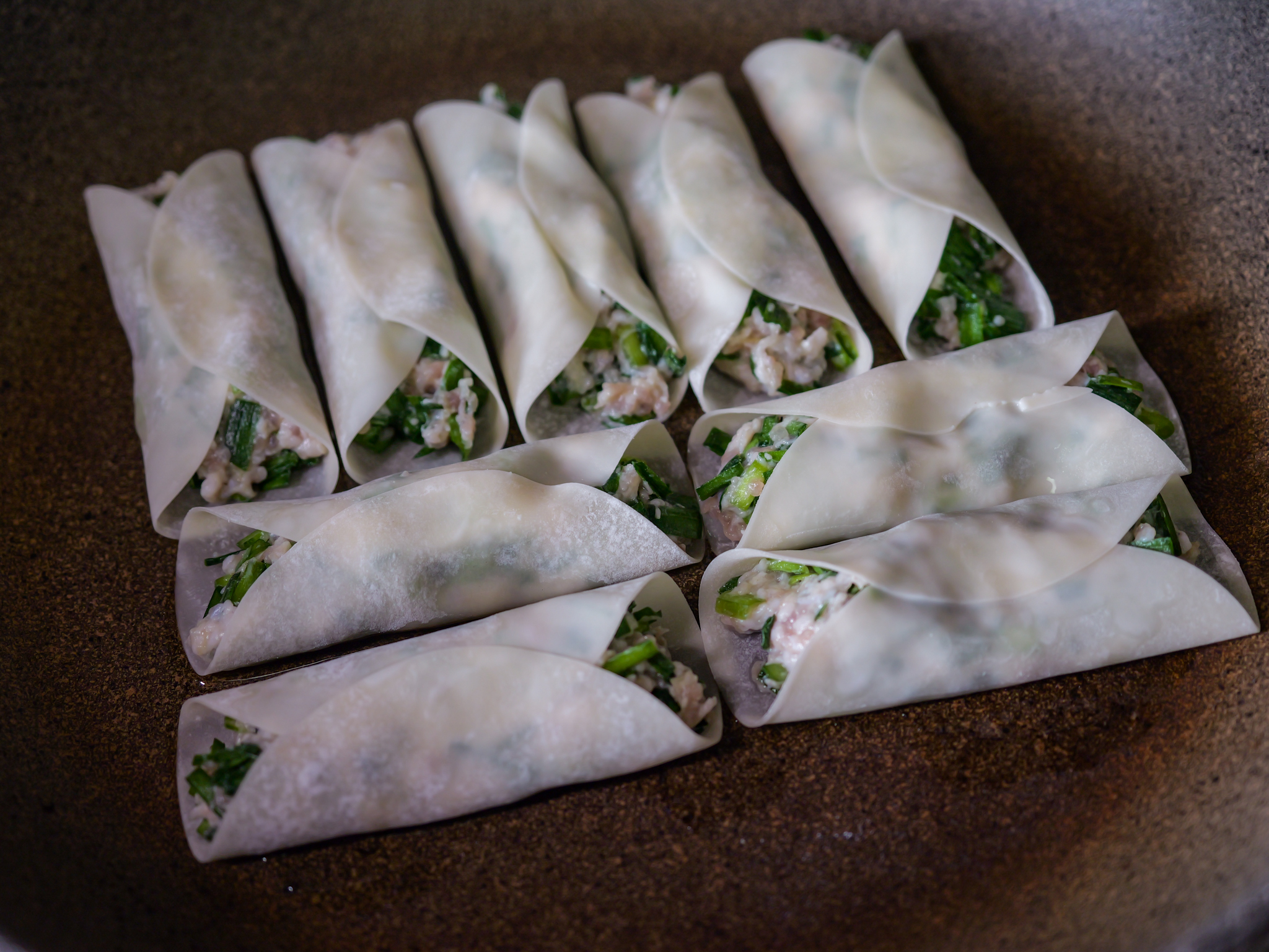 餃子の皮に肉ダネを乗せて、皮のふちに水をぬり、両端を折りたたむ。