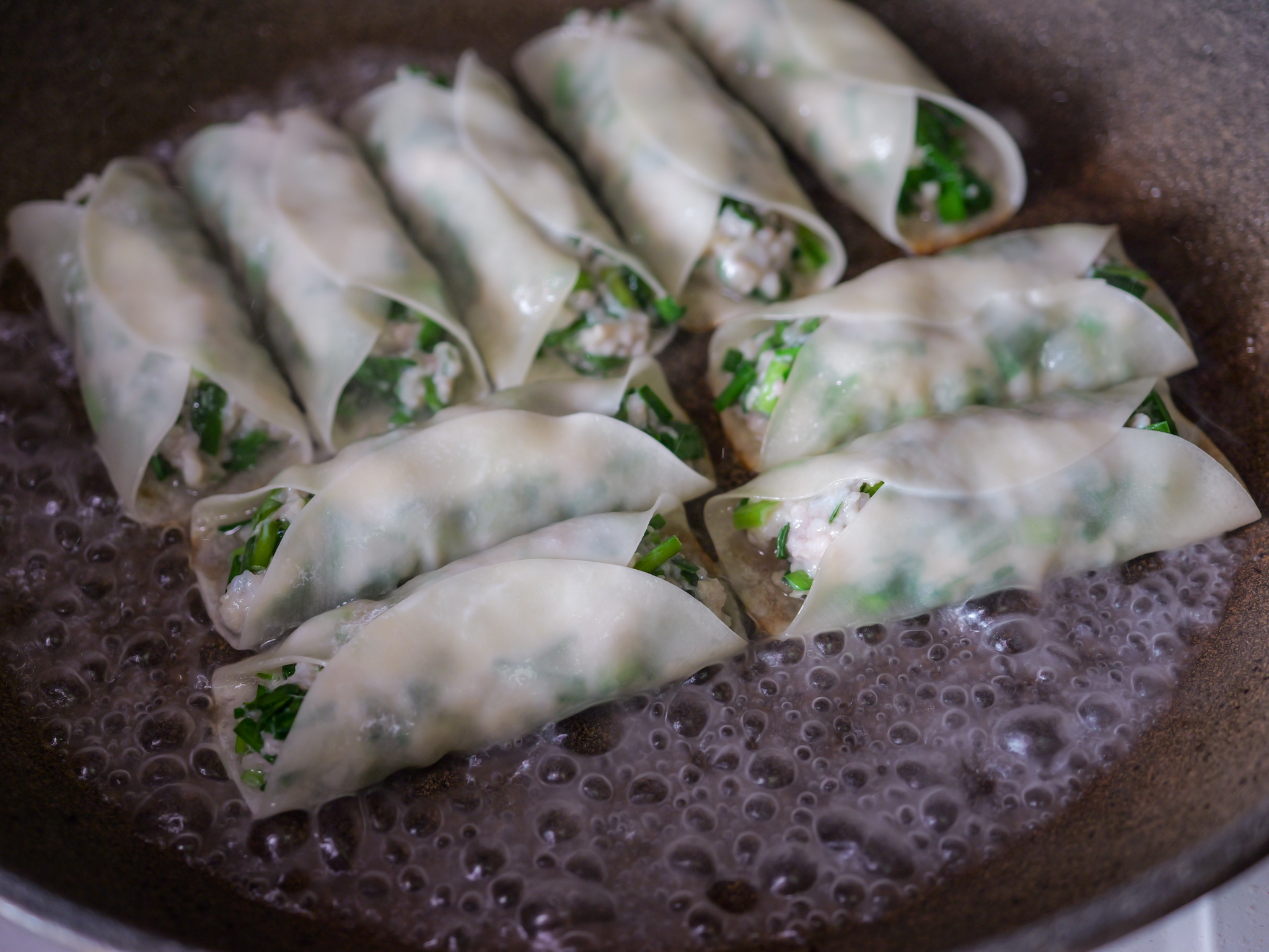 フライパンに大さじ1/2のごま油を敷いて、餃子を並べて中火で焼く