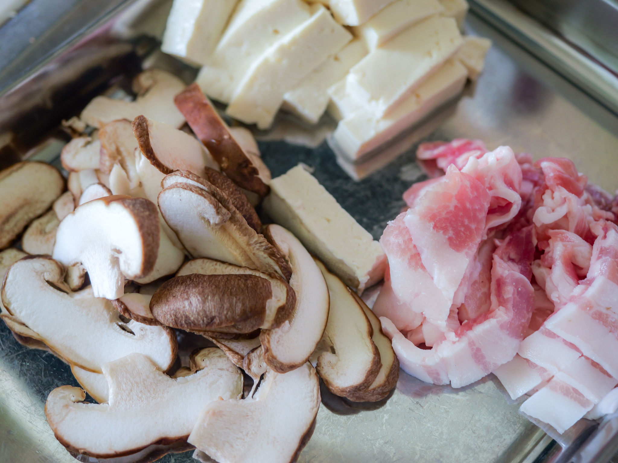 豚肉は細切り、椎茸は千切り、長ネギは斜め薄切り、豆腐は拍子木切りにする。