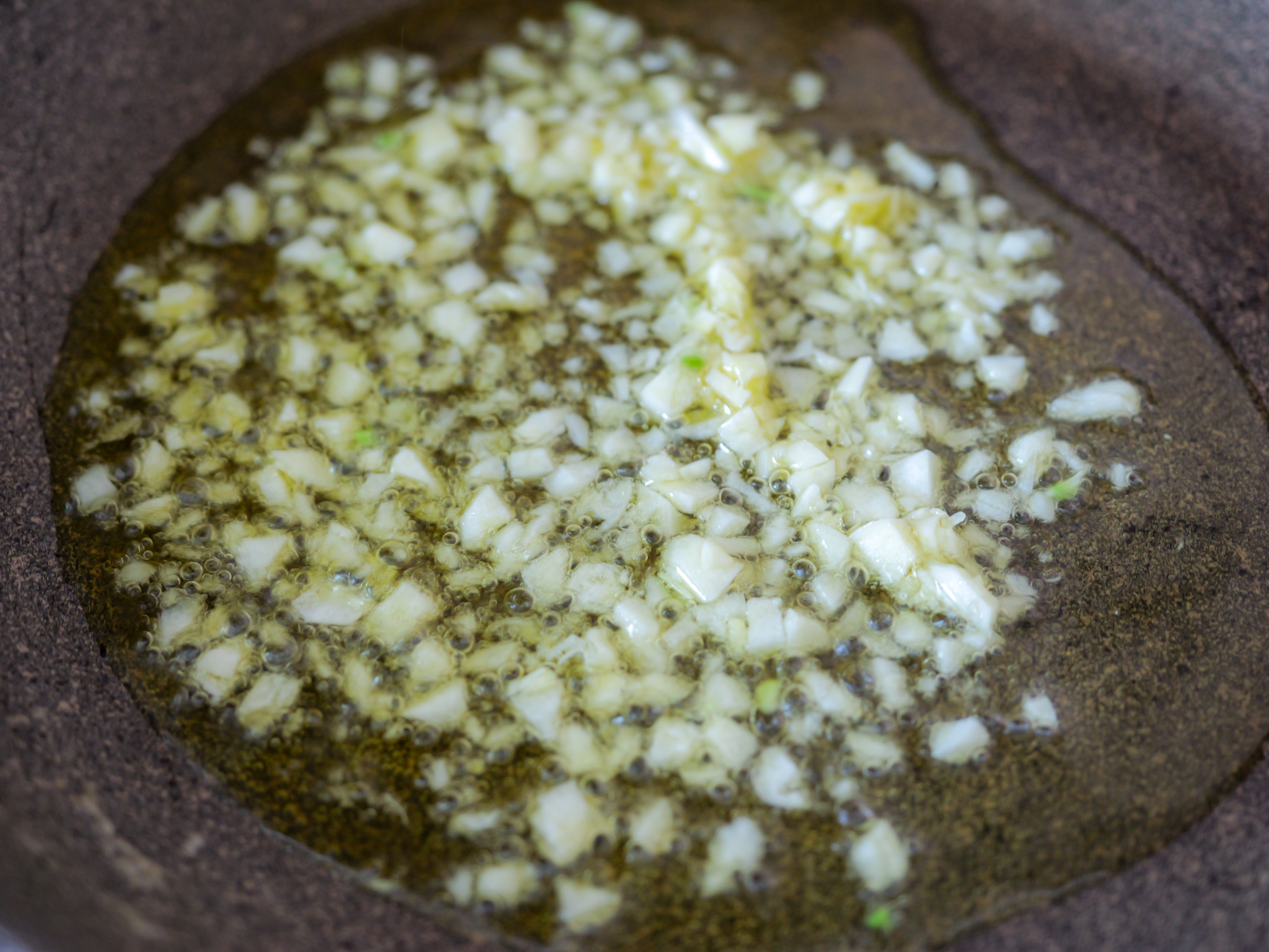 冷たいフライパンにオリーブオイルと粗みじん切りにしたにんにくを入れ、弱火にかける。