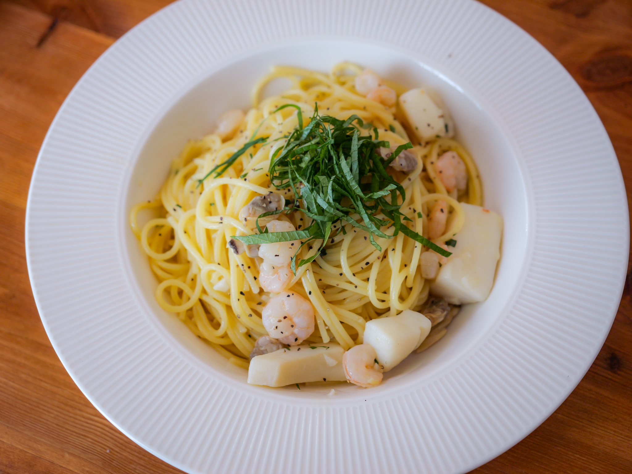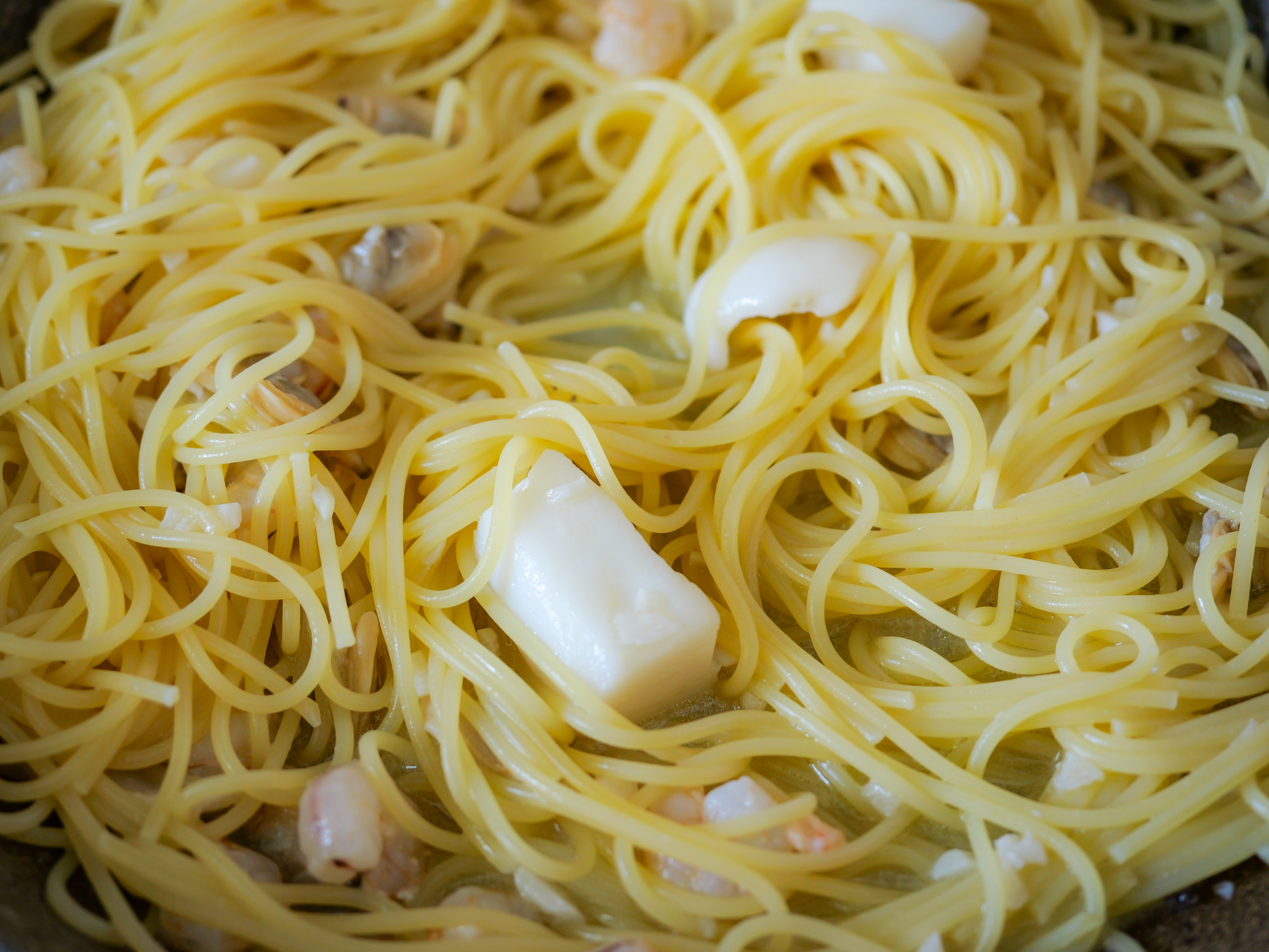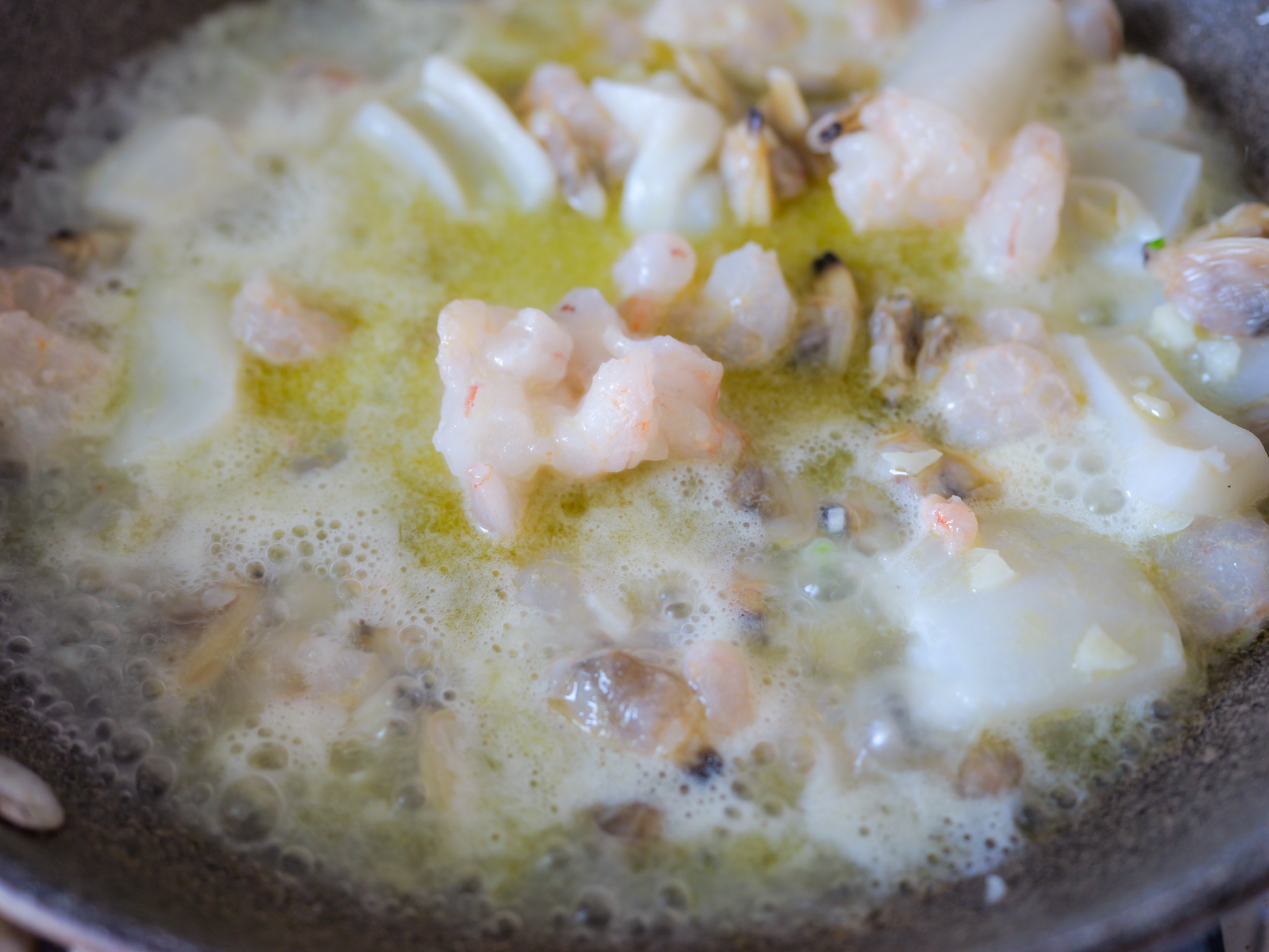 にんにくの香りが立ったら、シーフードミックスを加える。白ワインを入れ蓋をして2分間蒸し焼きにする。