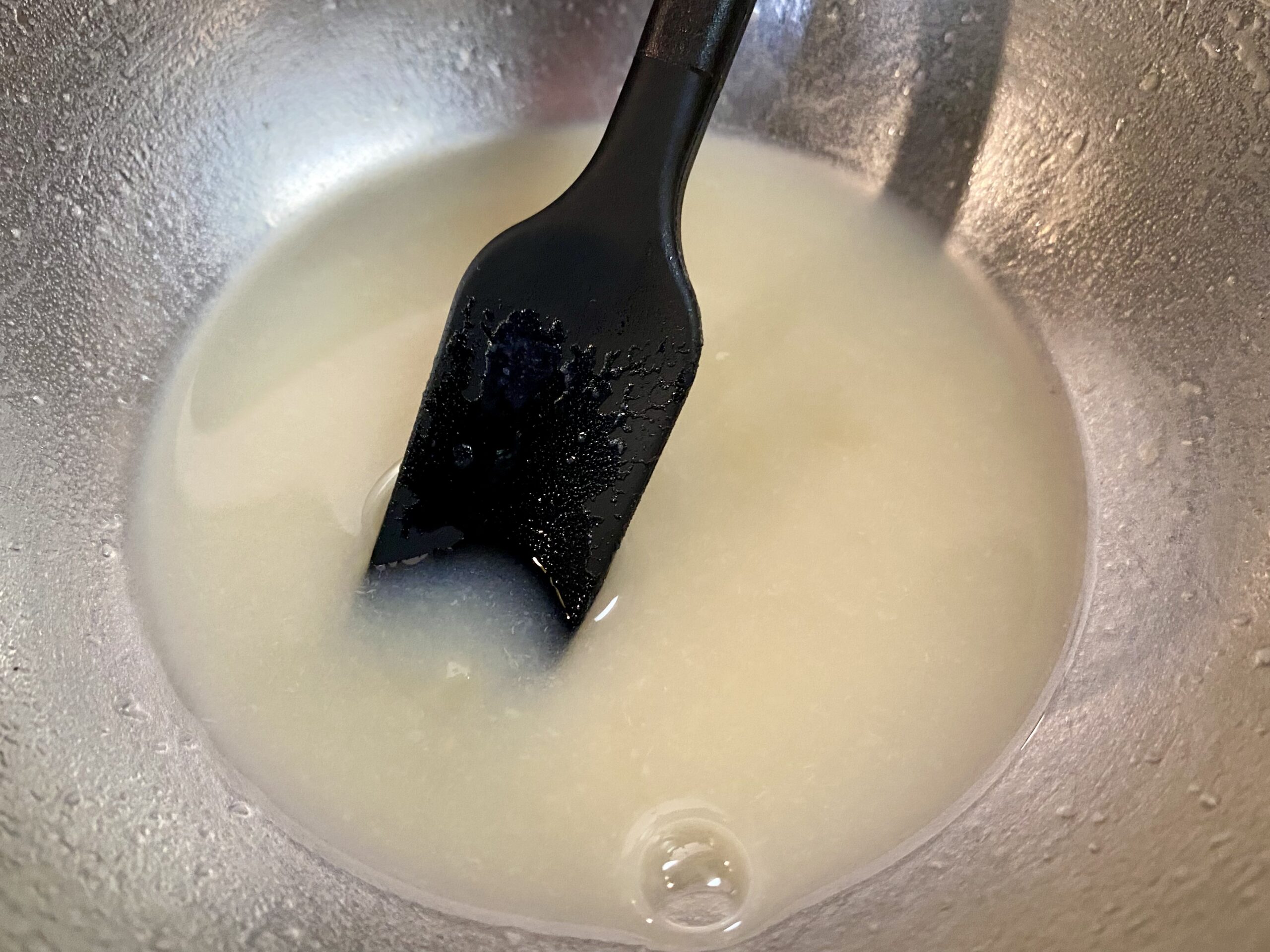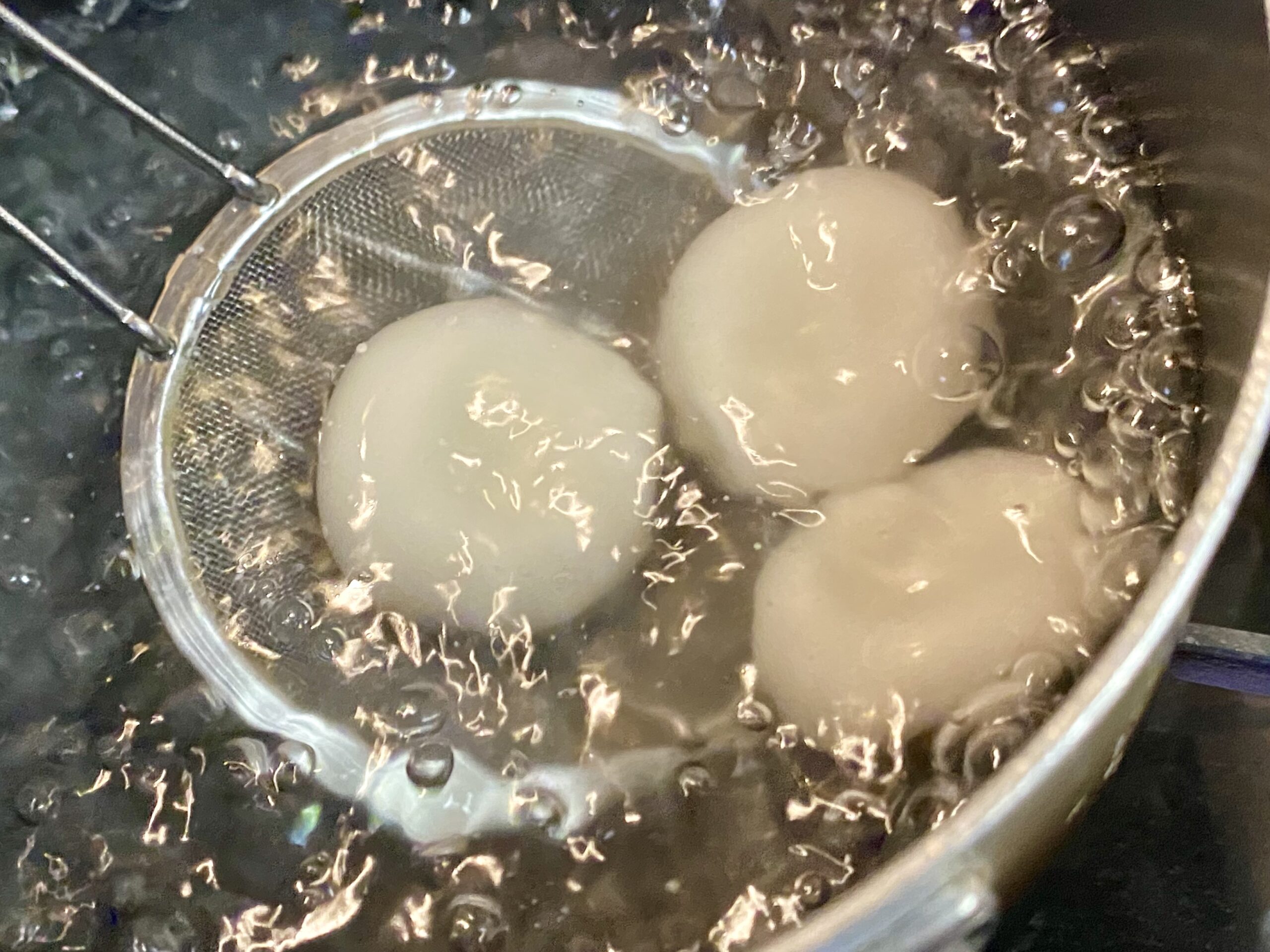 お湯を沸かし白玉を茹でる、浮き上がってきたら冷水にとる。