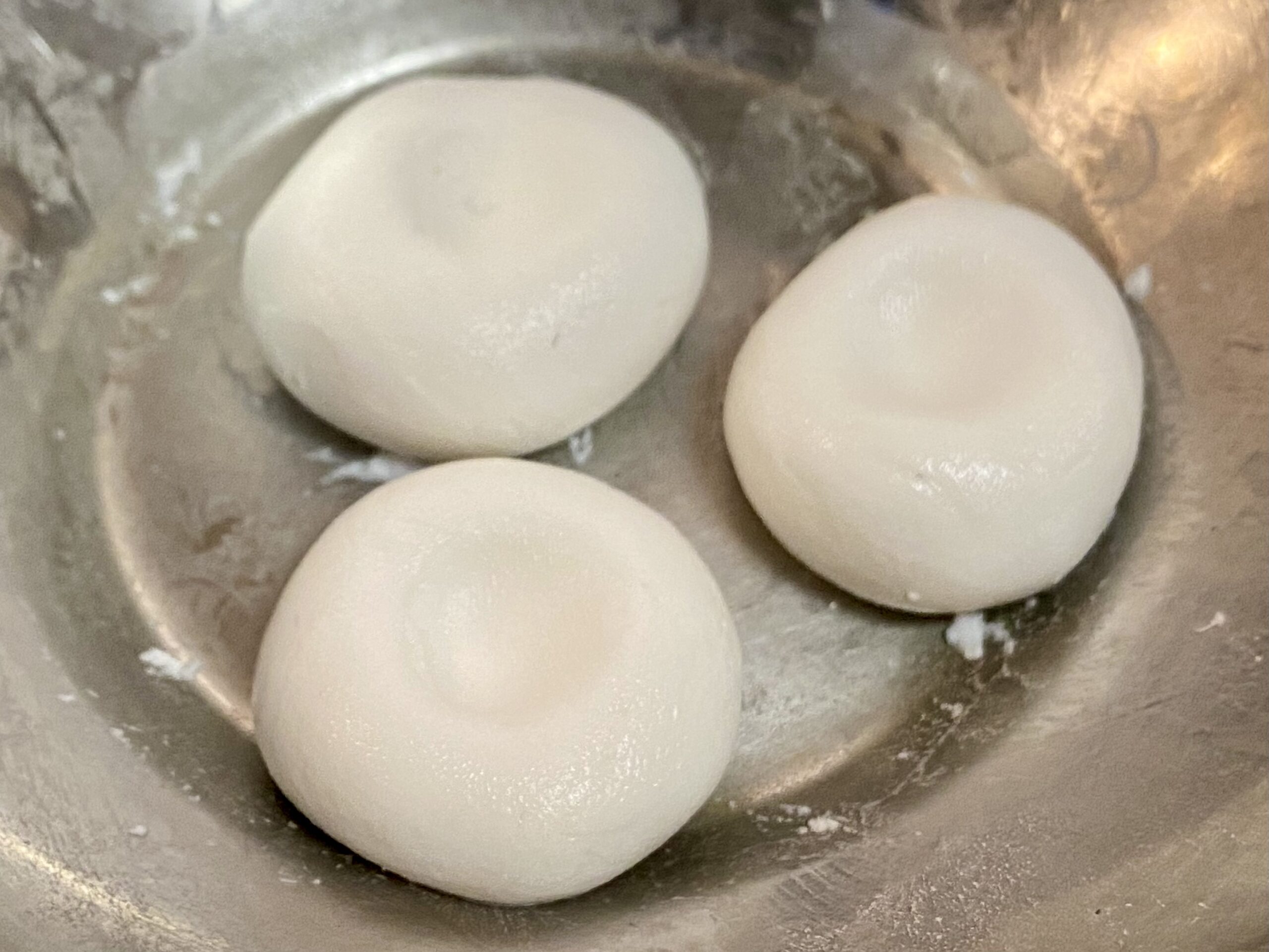 白玉粉を同量の水と練り、1つ10gで丸めて凹ませる。