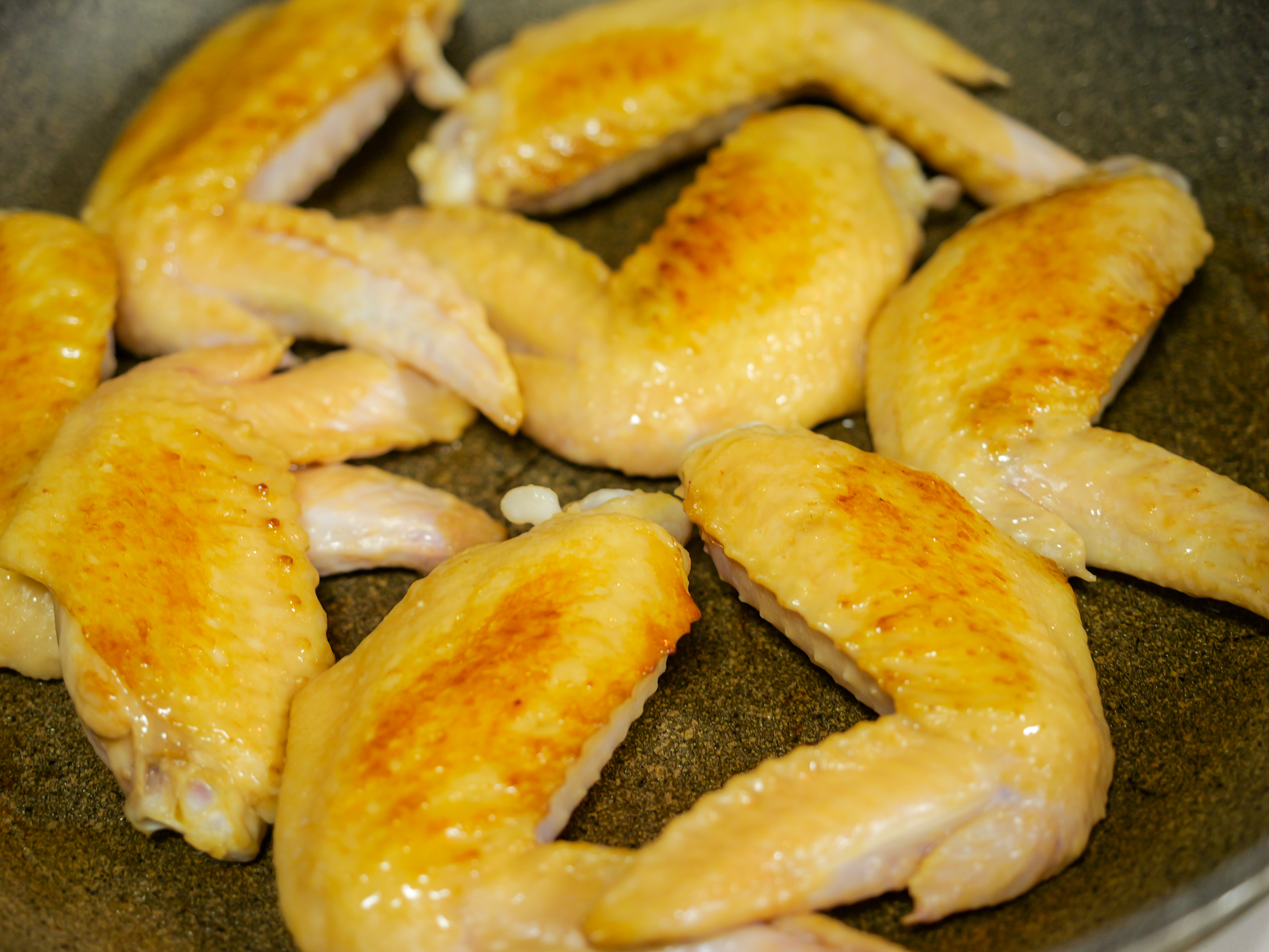 フライパンに油をひいて手羽先を焼く。