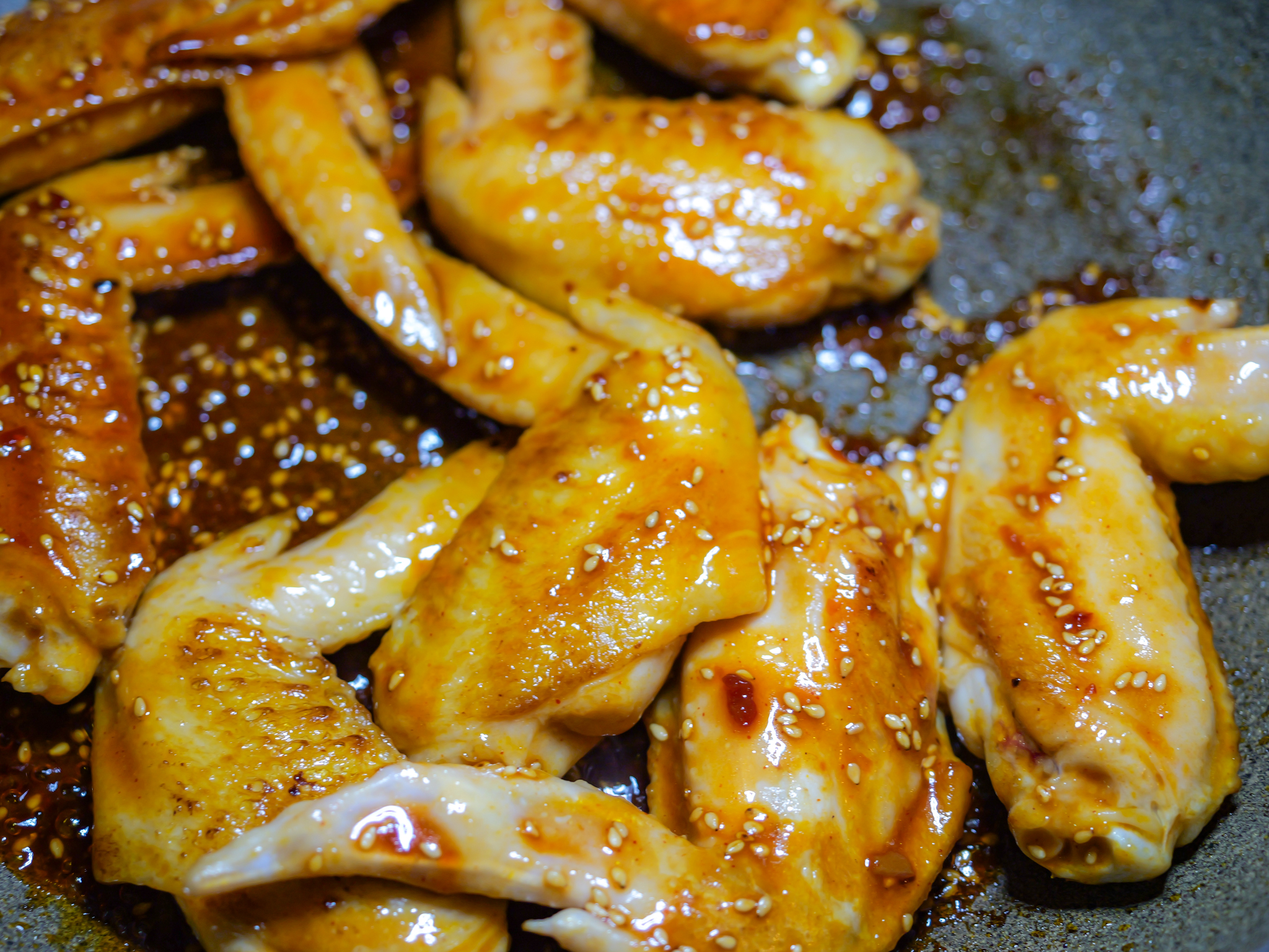 手羽先に火が通ったら、混ぜ合わせたタレとゴマを入れ絡めて完成。