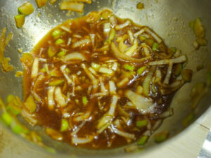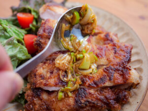 揚げ焼きした鶏肉にネギソースをかけて完成。